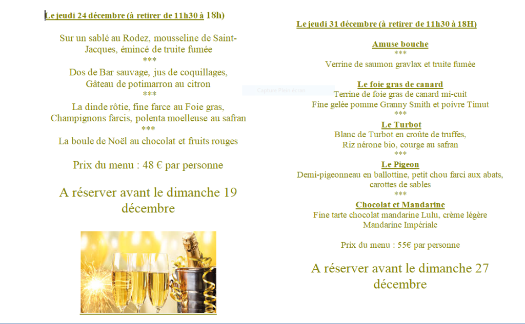 Liste des restaurants et des pâtisseries qui proposent des repas et des bûches pour les fêtes de Noël et/ou du Nouvel An.