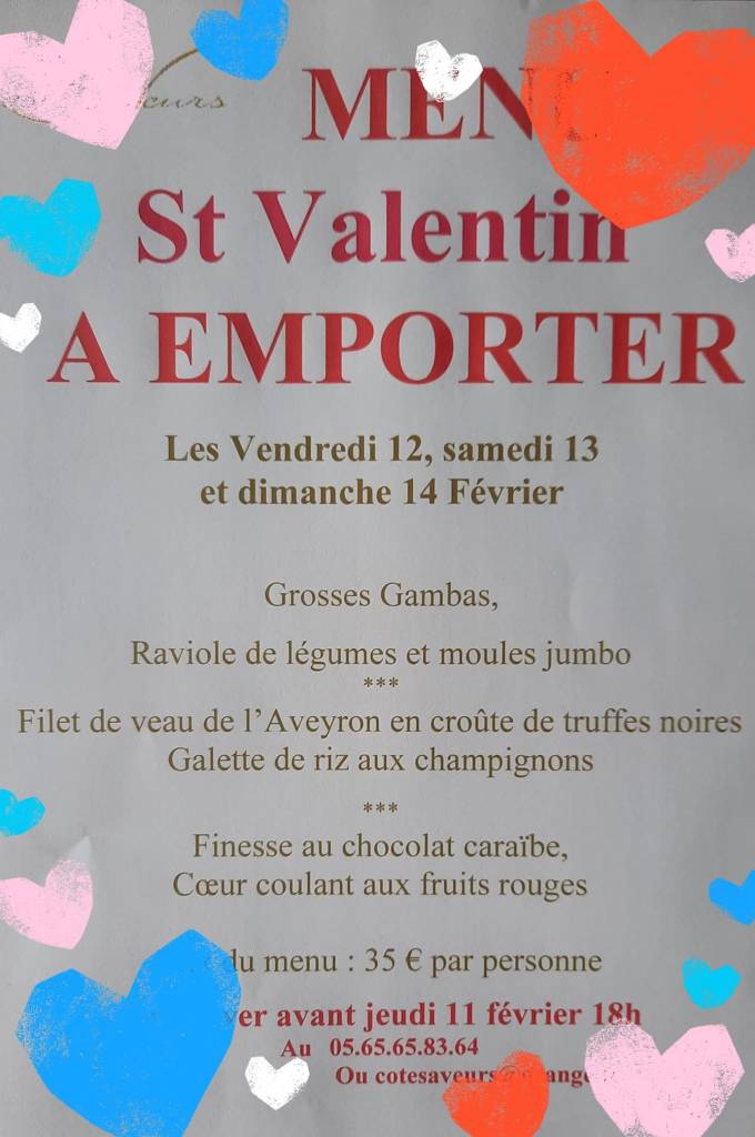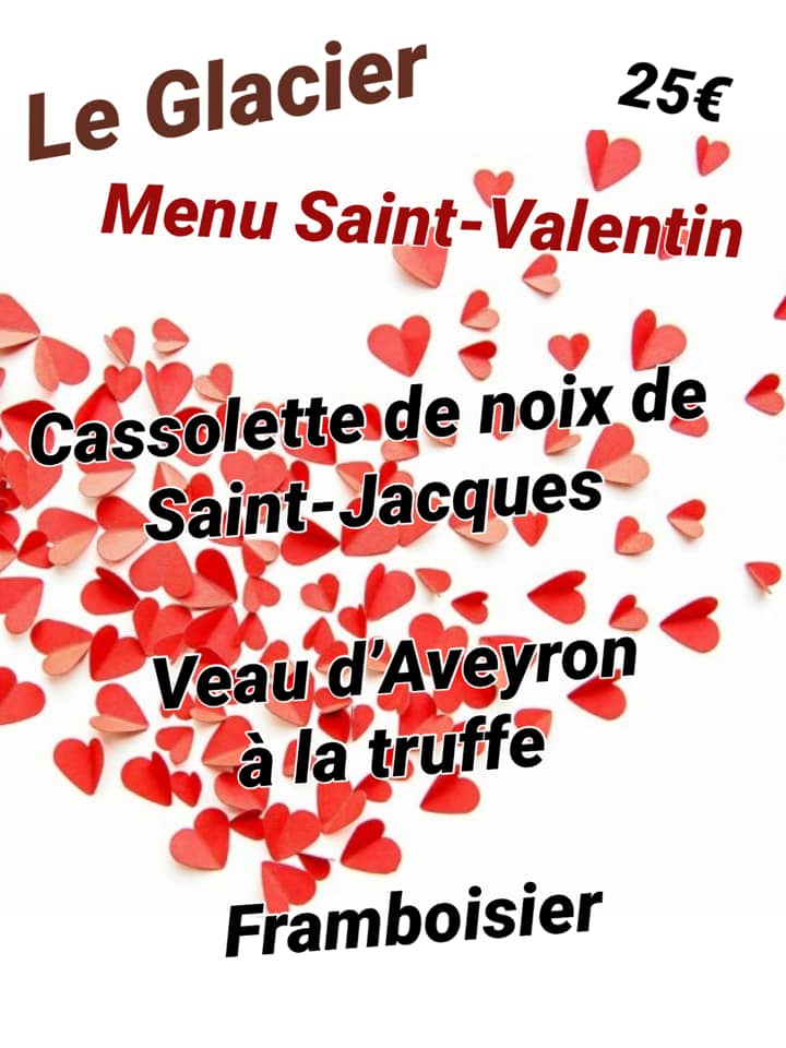 RESTAURANT LE GLACIER : Réservation au 05-65-45-18-83. Menu à retirer le dimanche 14 février entre 11h et midi au Glacier, 3 Place Jean-Jaurès.