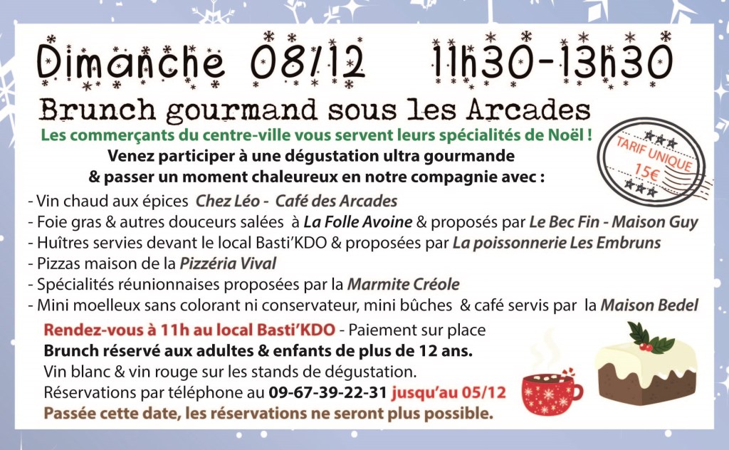 – Café des Arcades, chez leo : vin chaud aux épices pour se mettre dans l’ambiance de Noël – Au Bec Fin : foie gras & autres délices, avec un verre de vin rouge ! – Poissonnerie Les Embruns : huîtres & verre de vin blanc sec – Pizza Vival : pizzas maison, chaudes & généreusement garnies – La marmite créole : la Réunion & ses saveurs à Villefranche ! – Maison Bedel : des mini-fondants & des mini-bûches à tomber, avec un petit café s’il vous plaît !