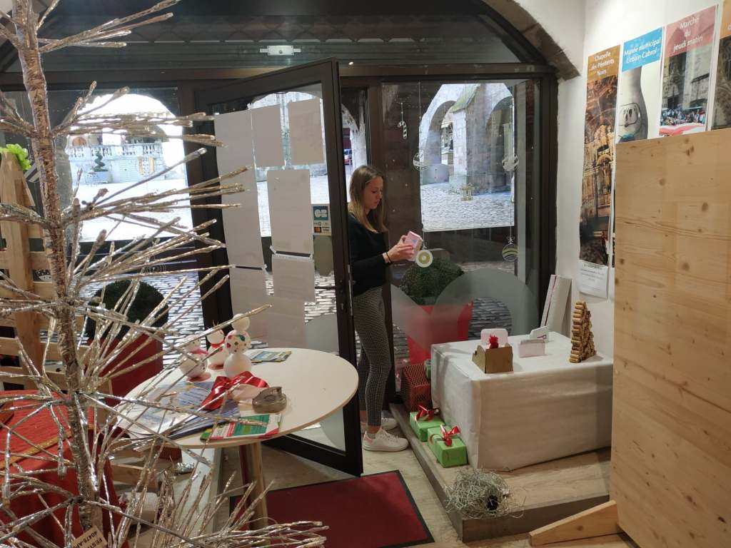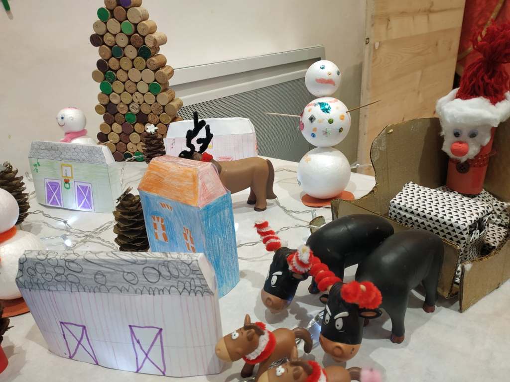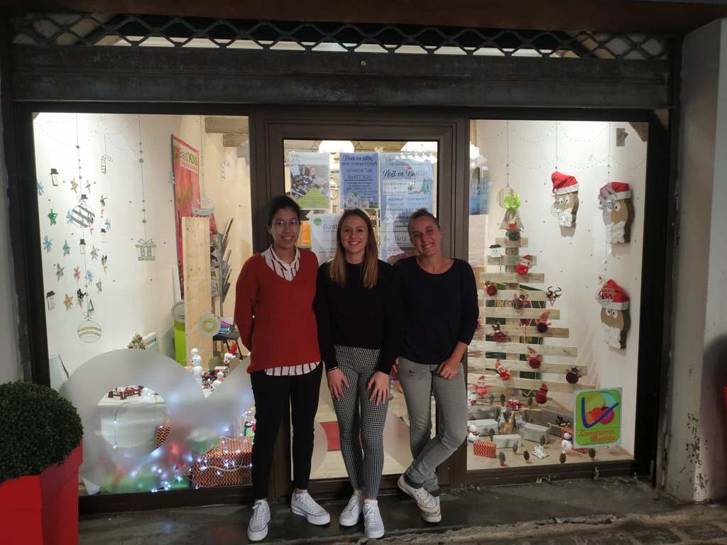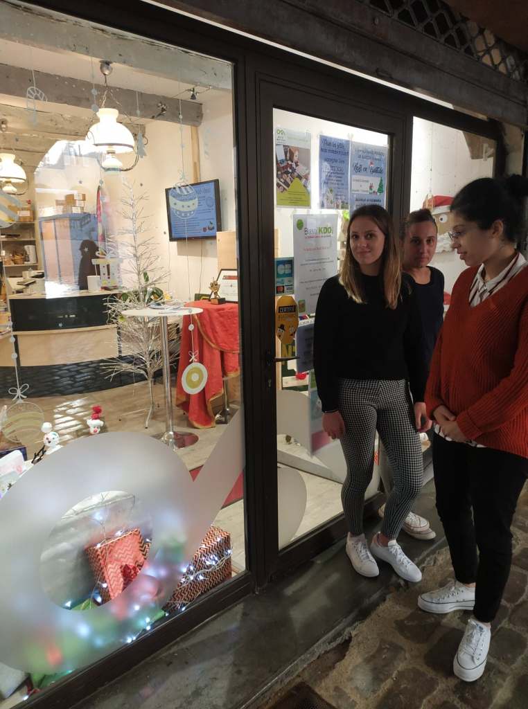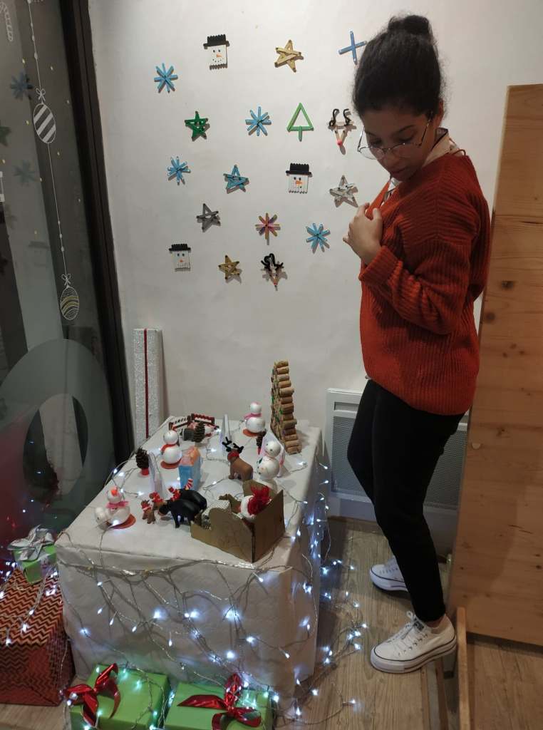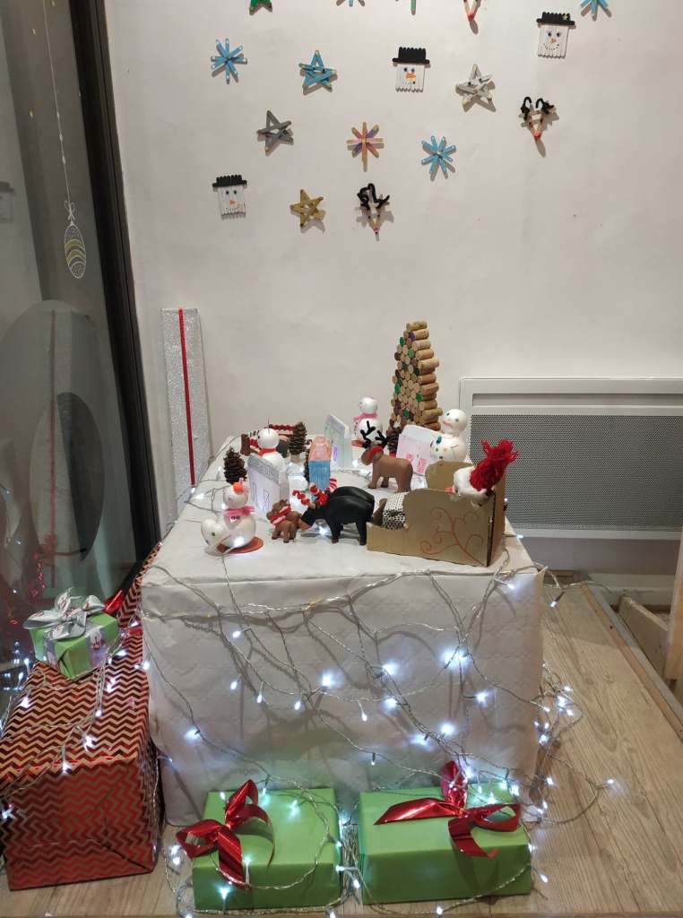 De gauche à droite : Sarah – service civique ASCO, Léa – stagiaire du centre-social et Stéphanie – responsable ASCO.Léa, stagiaire du centre social, prépare la vitrine. Léa, stagiaire du centre social, très concentrée…Sarah, en service civique à l’ASCO réalise le mur à partir de bâtonnets de glace. Avec des matériaux recyclés, de très belles créations sont possible !Le sapin en bouchons de liège, une idée futée !Des maisons en papier, des bonhommes de neige en polystyrène, un traîneau en carton, des vaches et des chevaux transformés en rennes et la magie de Noël opère !Le résultat est magnifique ! Merci beaucoup les filles !!Mille mercis les filles !