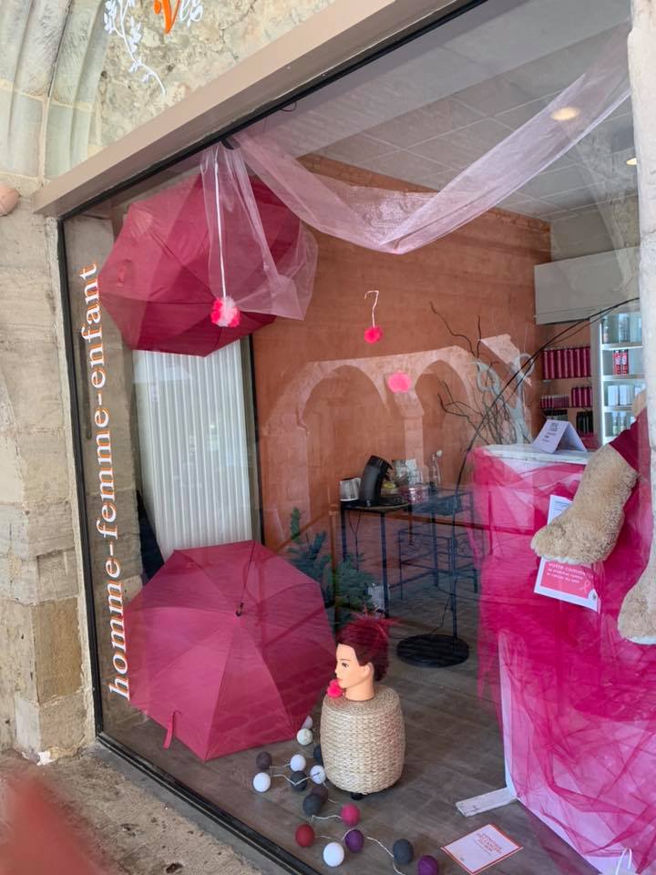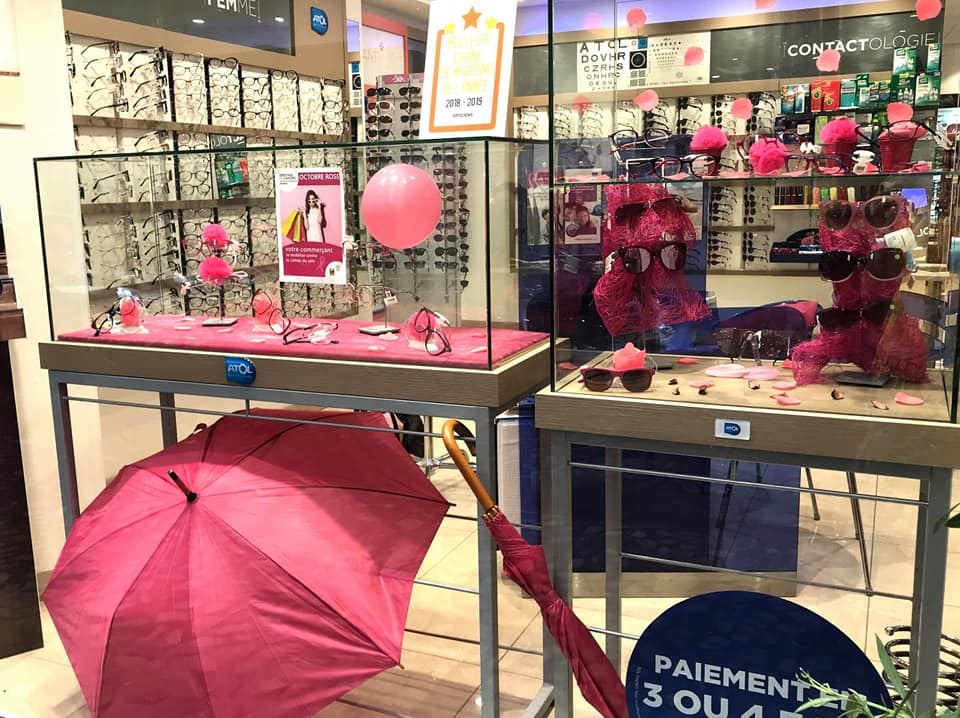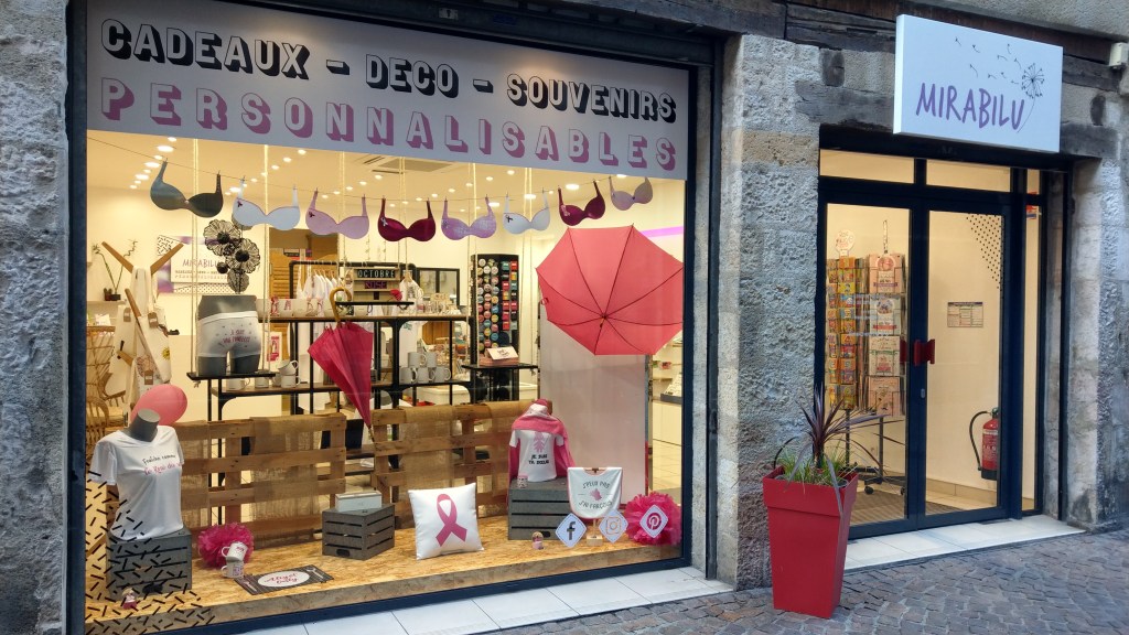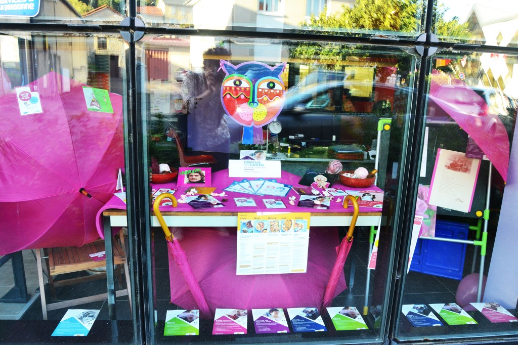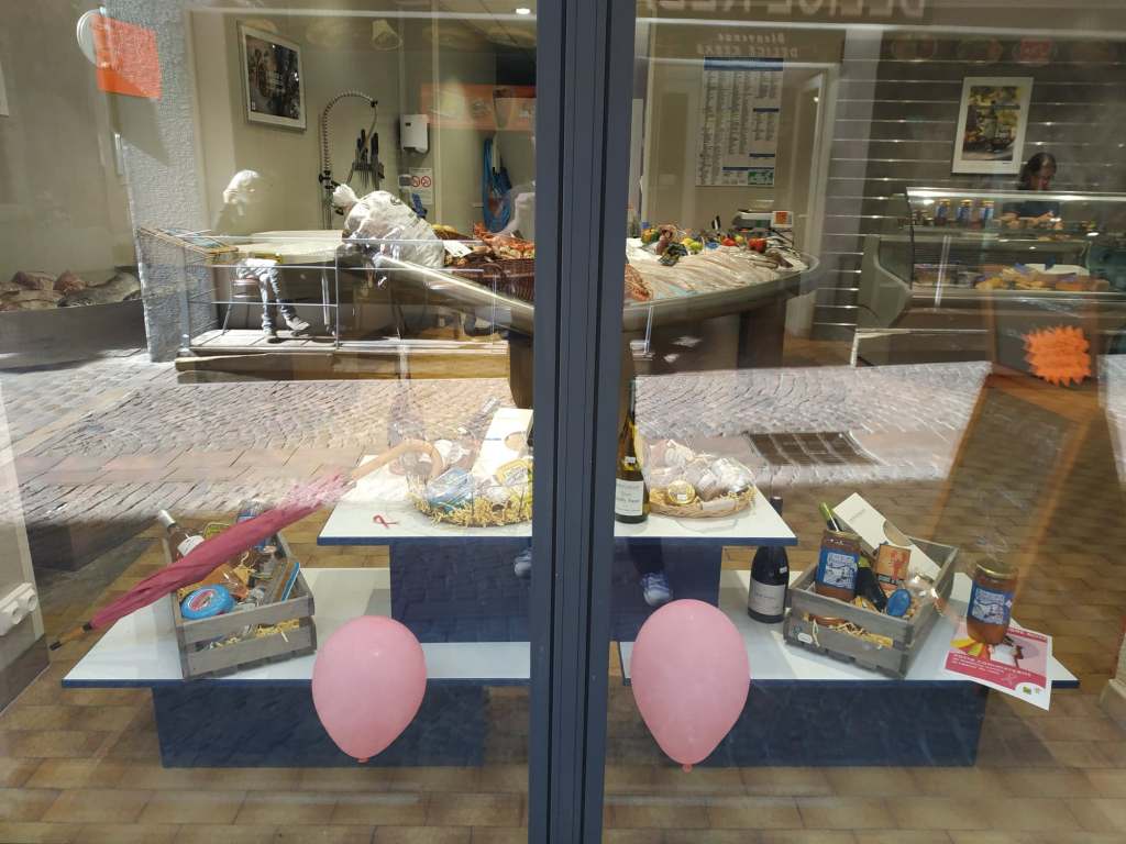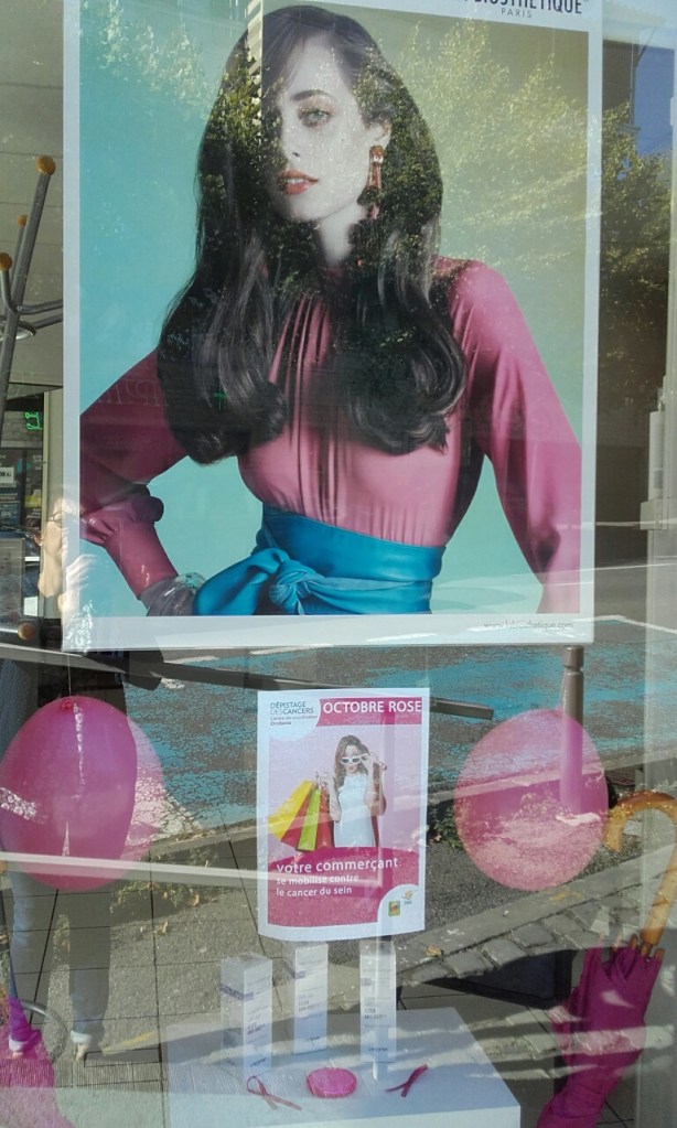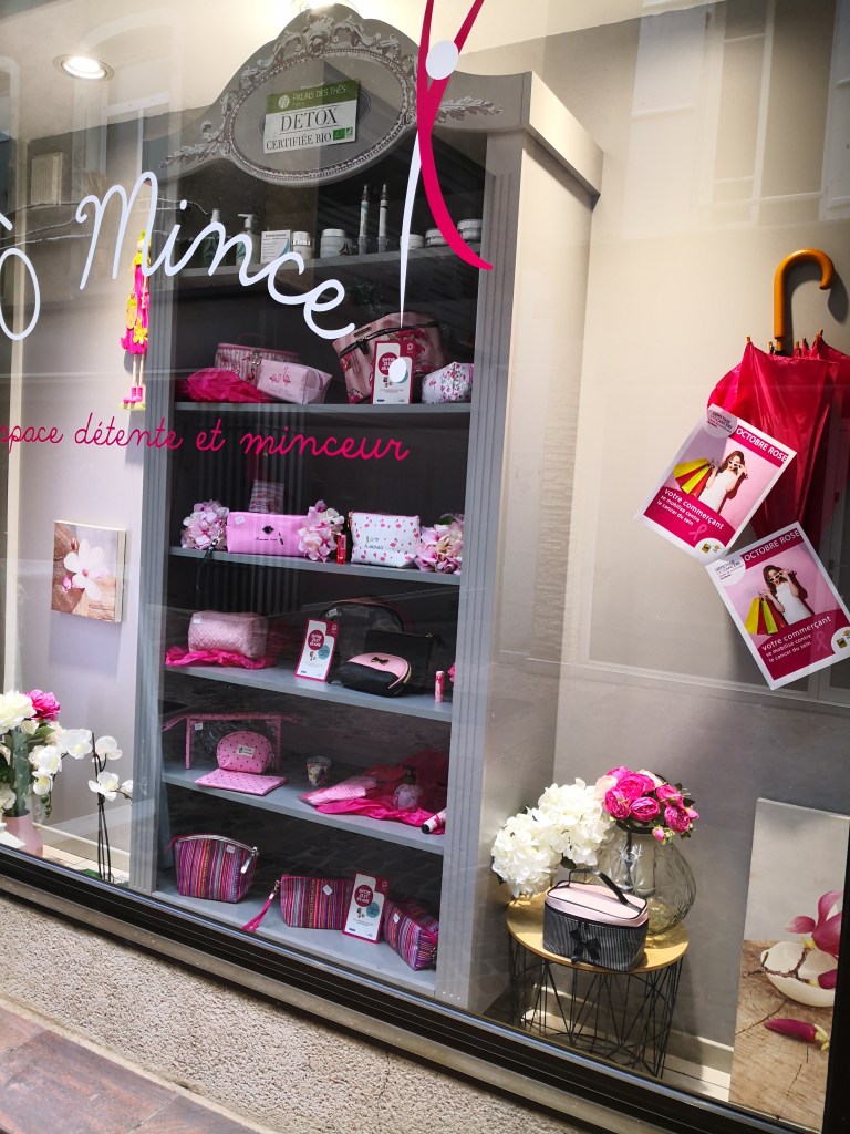 Sur les vitrines des commerçants membres de l’Association Commerces en Bastide à l’occasion d’Octobre rose.