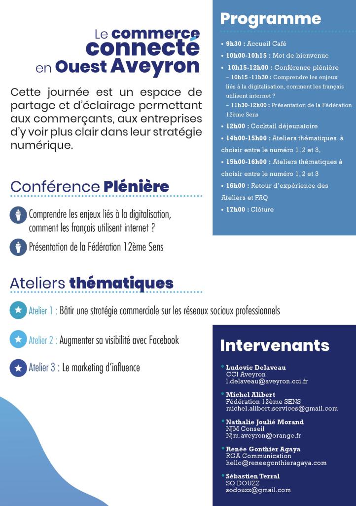 La Chambre de Commerce de l’Aveyron en partenariat avec Ouest Aveyron Communauté et la Fédé 12è sens propose à tous les commerces de Villefranche de participer, lundi 4 novembre toute la journée, à une conférence suivie d’ateliers sur les stratégies commerciales à mettre en place sur le Web.