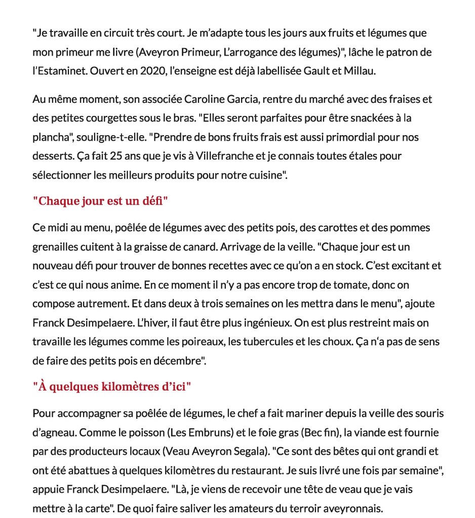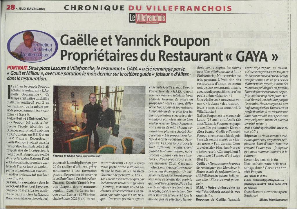 Article dans Le Villefranchois du 06/04/2023 sur le succès des restaurateurs du Gaya.