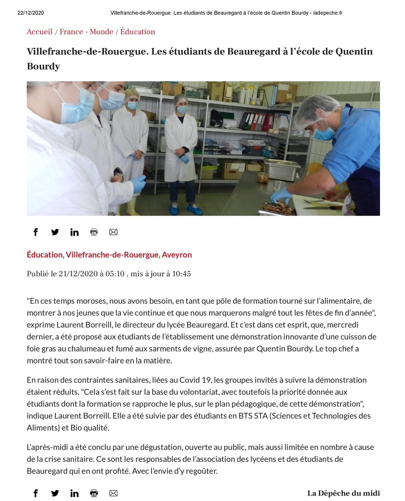 Article de La Dépêche du 11/12/2019 sur la médaille d’argent reçue par Jean-Michel MALZAC artisan boucher situé rue Durand de Montlauzeur lors du concours foie gras et salaisons organisé par la Chambre d’Agriculture