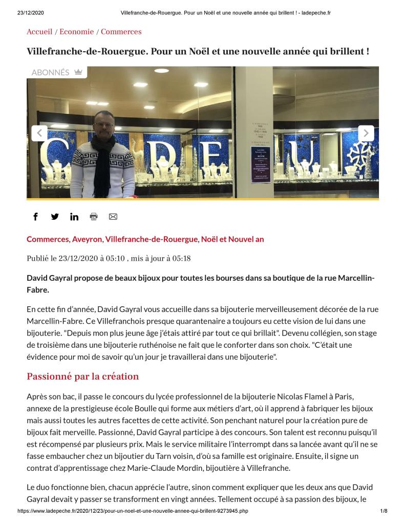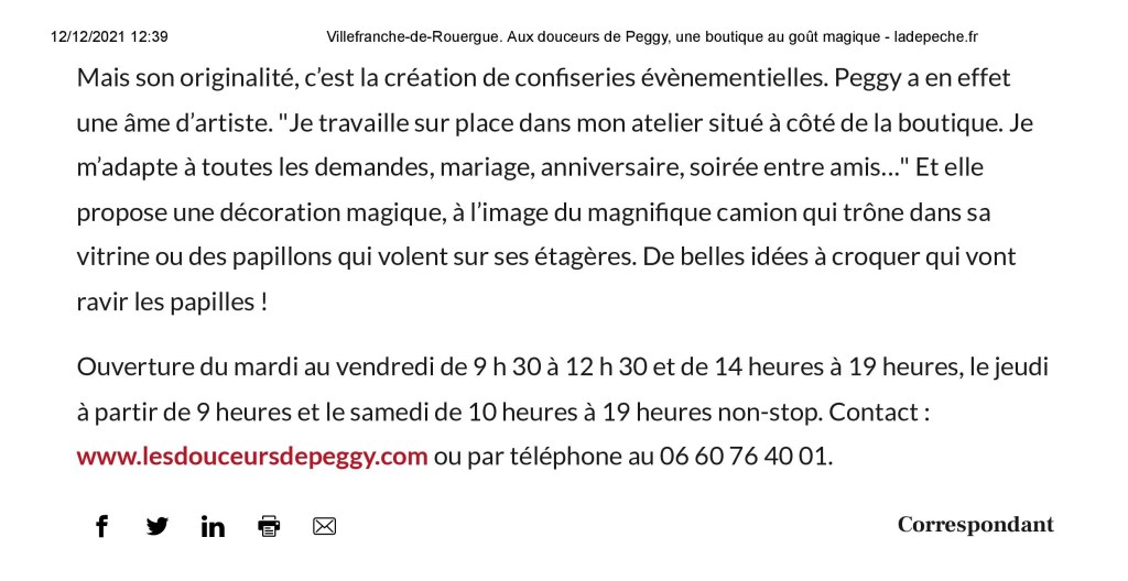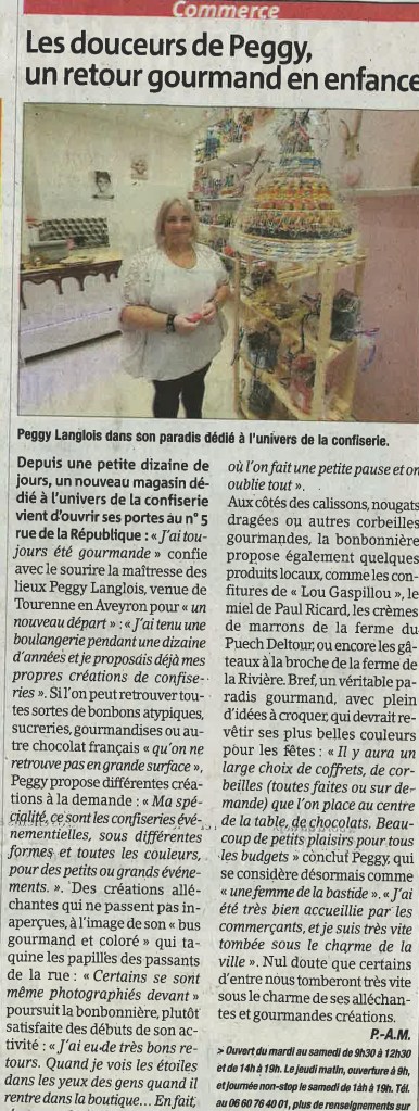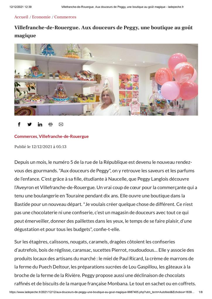 Article paru dans La Dépêche du 12/12/2021 sur l’ouverture des Douceurs de Peggy.