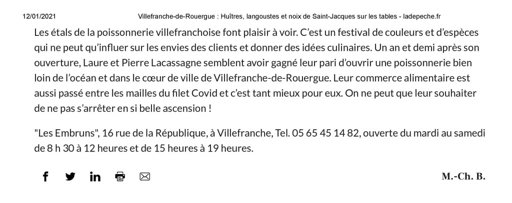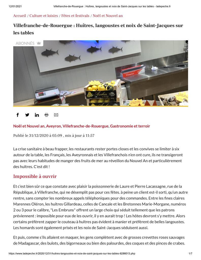 Article de La Dépêche du 22/101/2019 sur l’inauguration de la poissonnerie Les Embruns