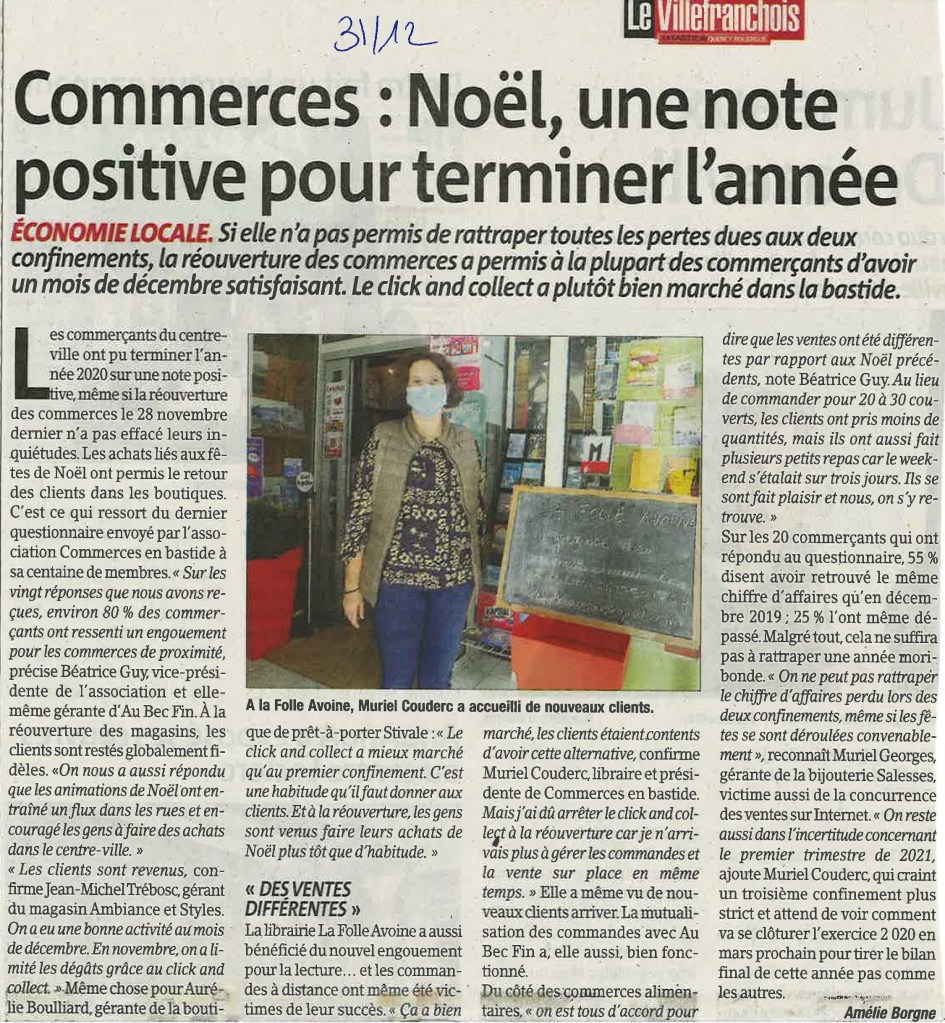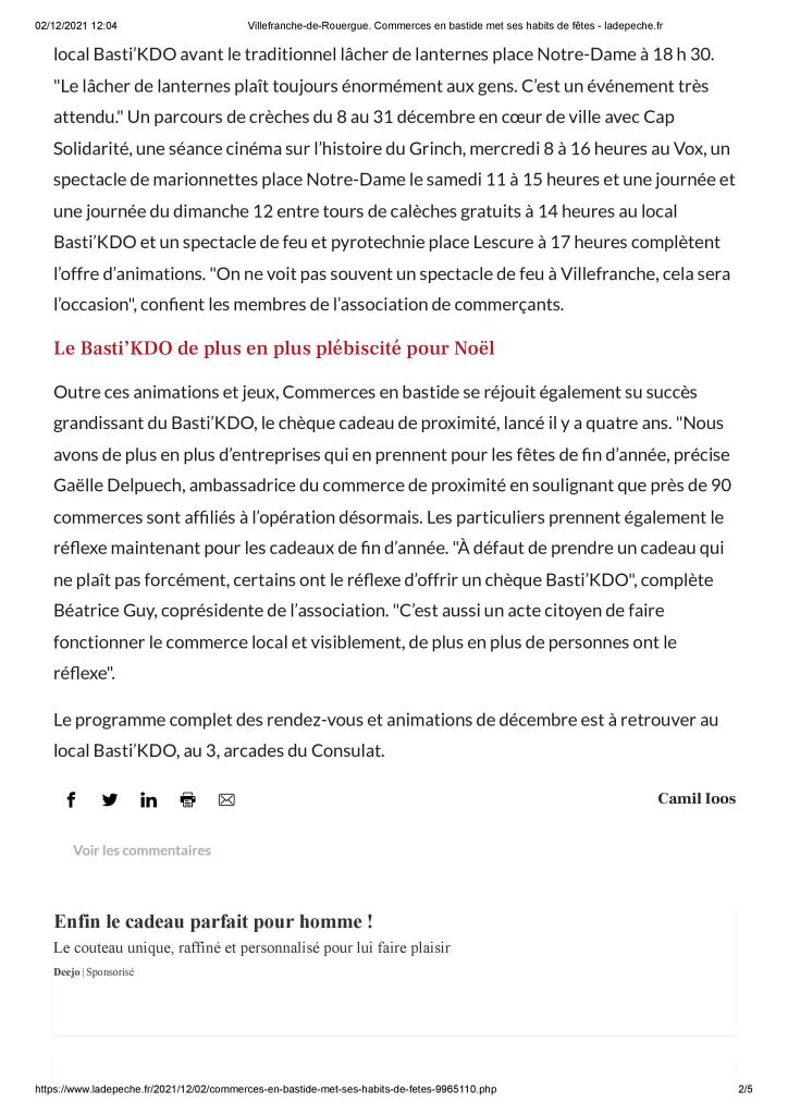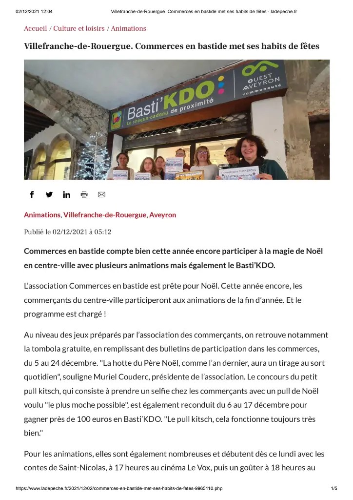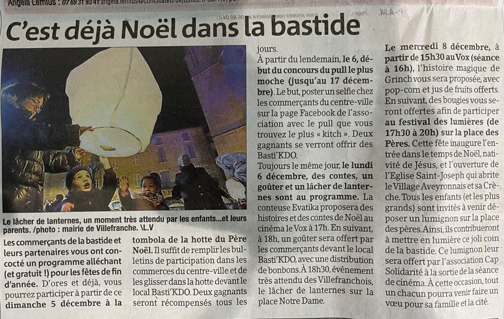 Article paru dans Le Villefranchois du 25/11/2021 sur le programme des animations de Noël de l’association Commerces en Bastide.