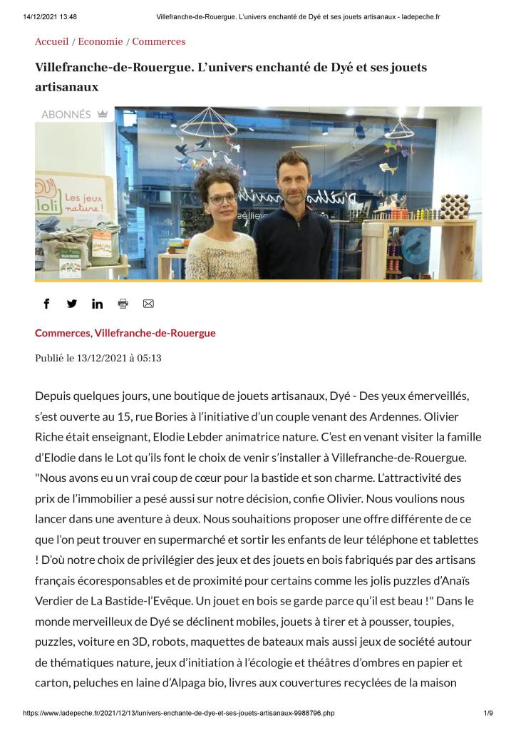 Article paru dans La Dépêche du 13/12/2021 sur l’ouverture de Dyé
