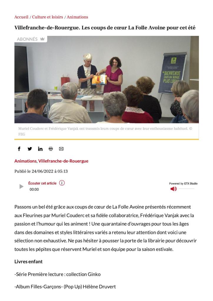 Article paru dans La Dépêche du 24/06/22 concernant les coups de cœur de La Folle Avoine pour cet été.