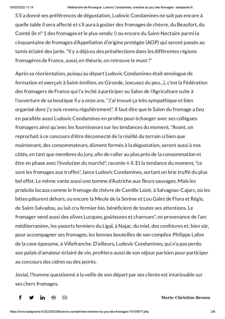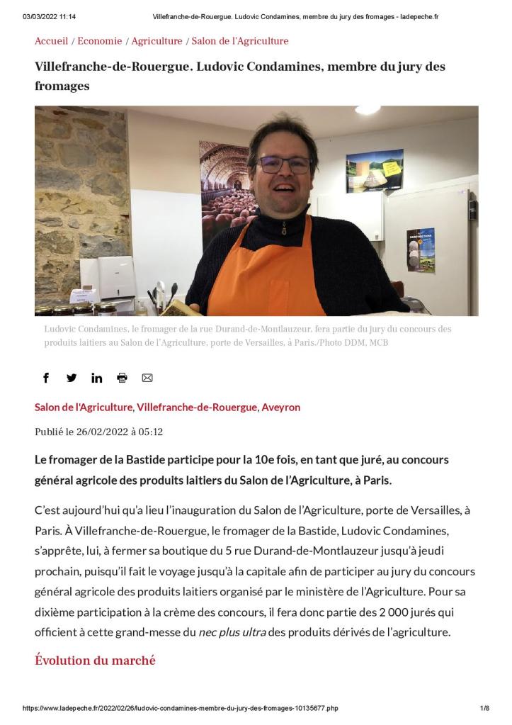 Article paru dans La Dépêche du 22/02/2023 sur la participation de Ludovic Condamines fromager en Bastide, au salon de l’Agriculture.
