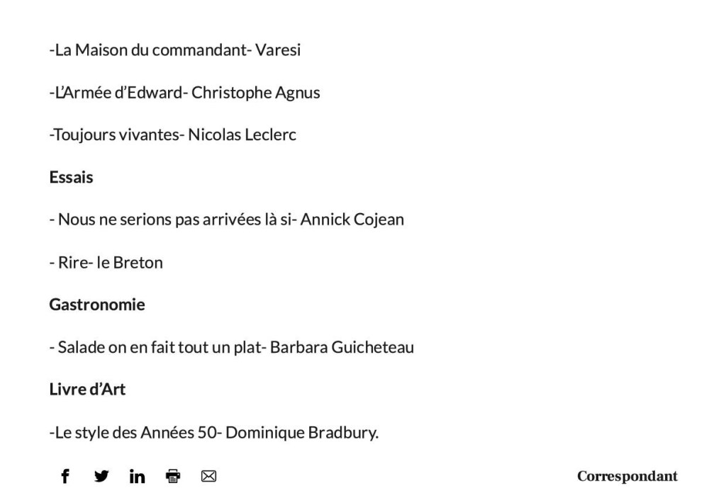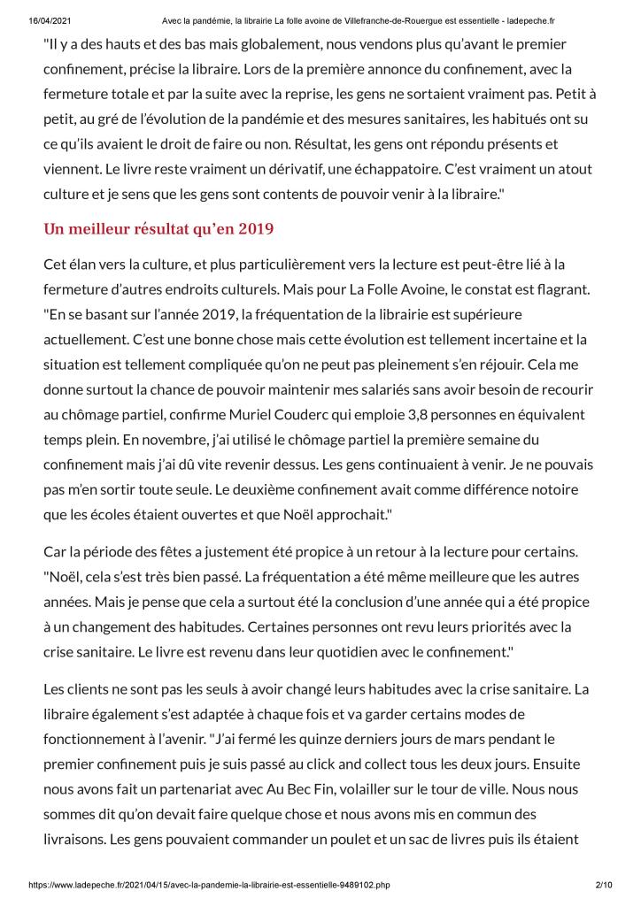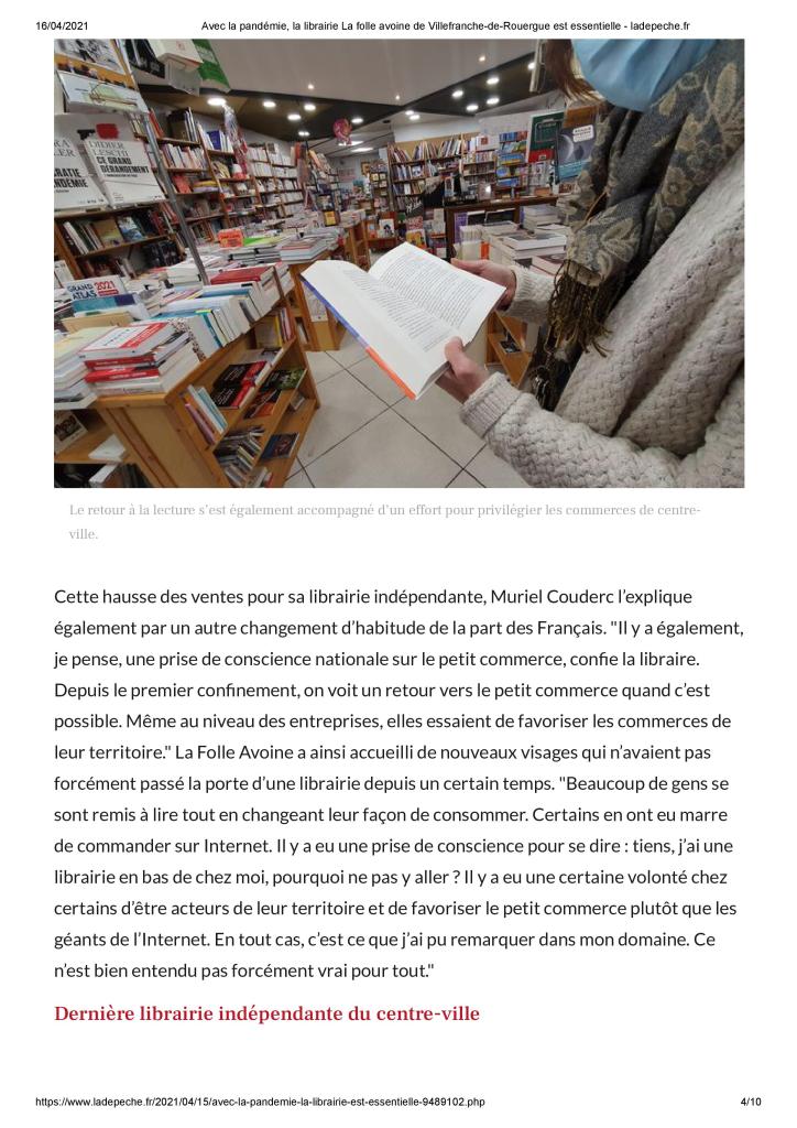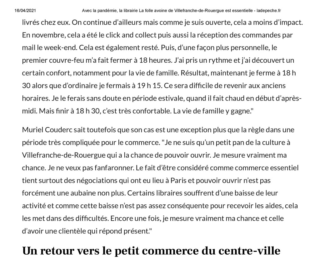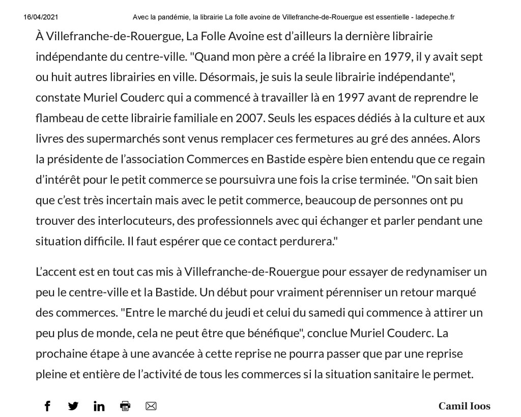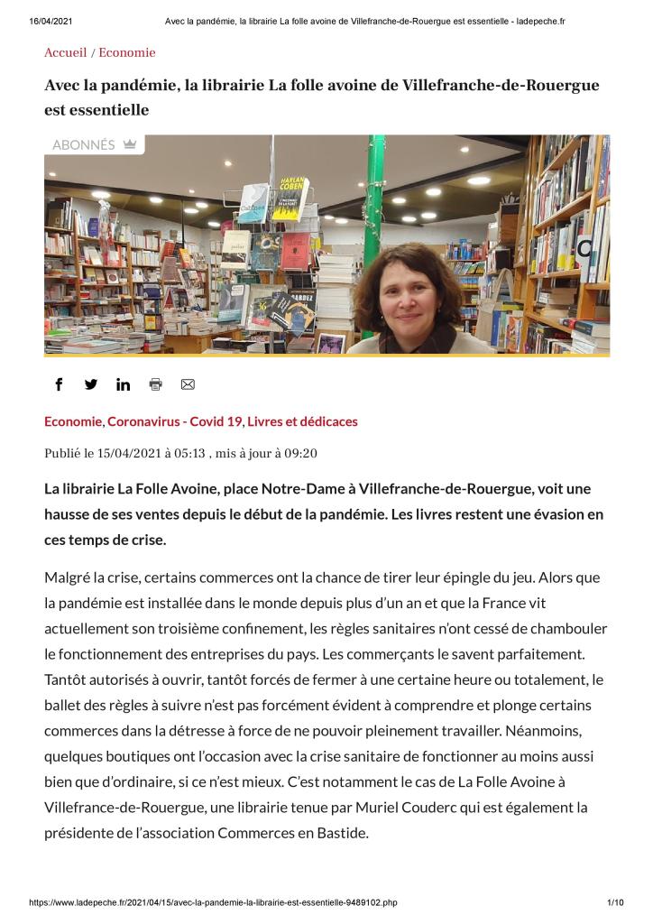 Article de La Dépêche du 21/04/2020 sur les coups de cœur de notre libraire Muriel Couderc.