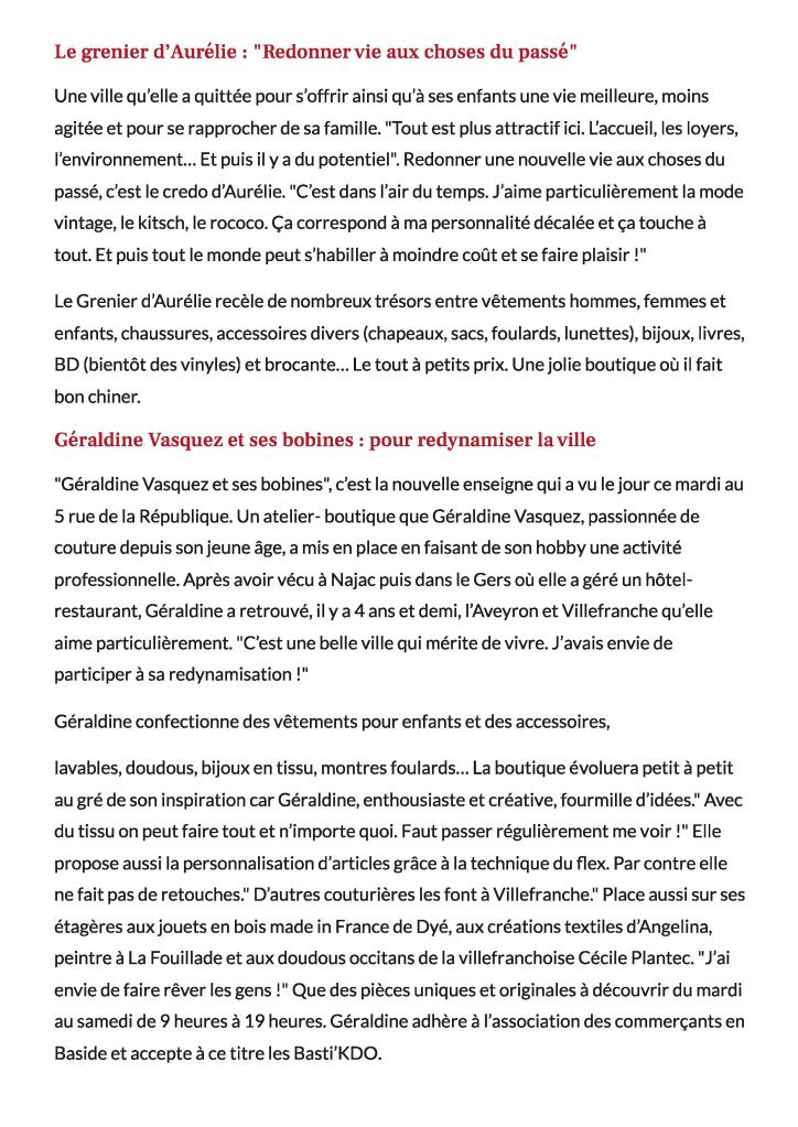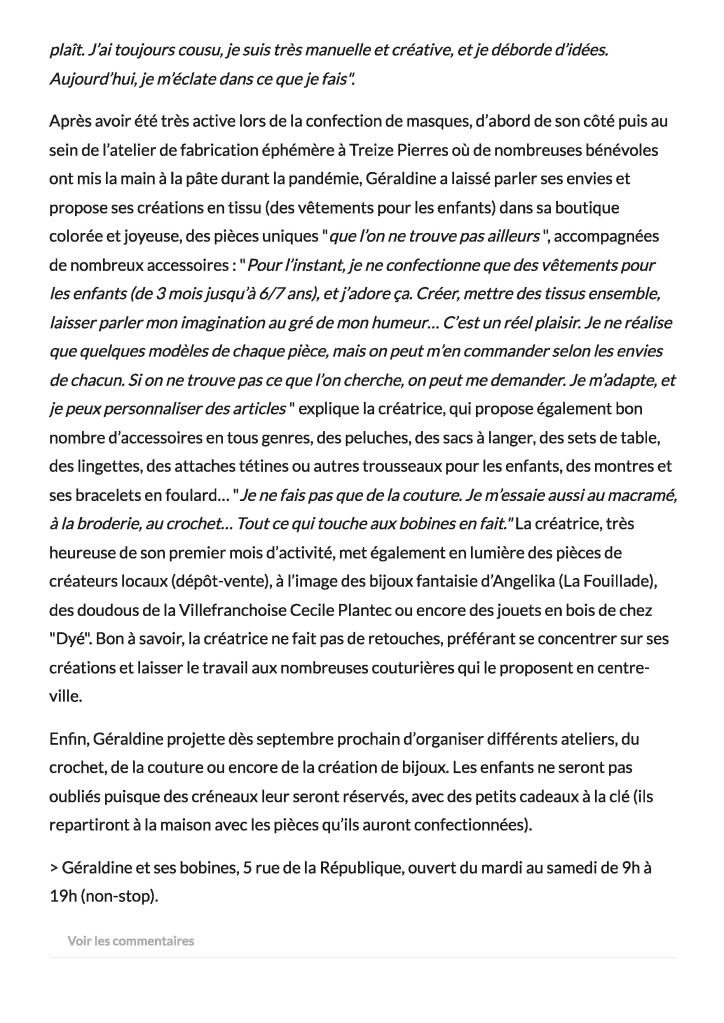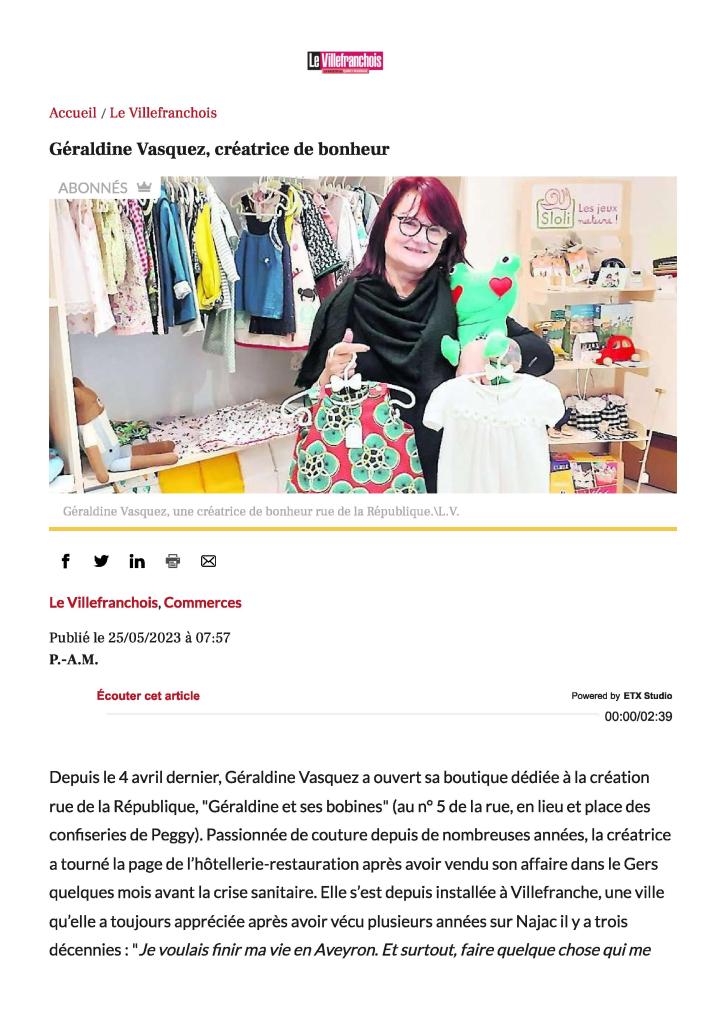 Article paru dans le Villefranchois du 25/05/2023 sur l’ouverture de Géraldine et ses Bobines.