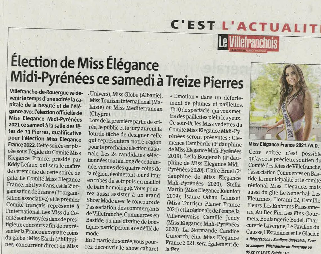 Article paru dans Le Villefranchois du 25/11/2021 sur l’élection Miss Elégance du 27/11/2021 organisée par le Comité Miss Elégance en partenariat avec Commerces en Bastide et Le Comité des Fêtes.