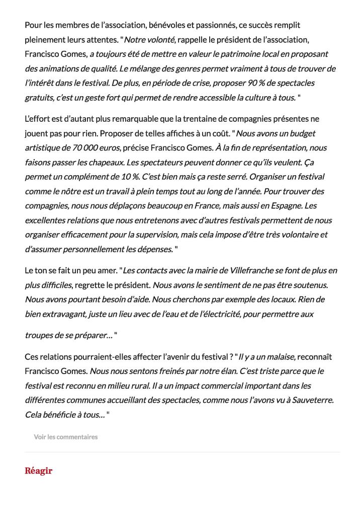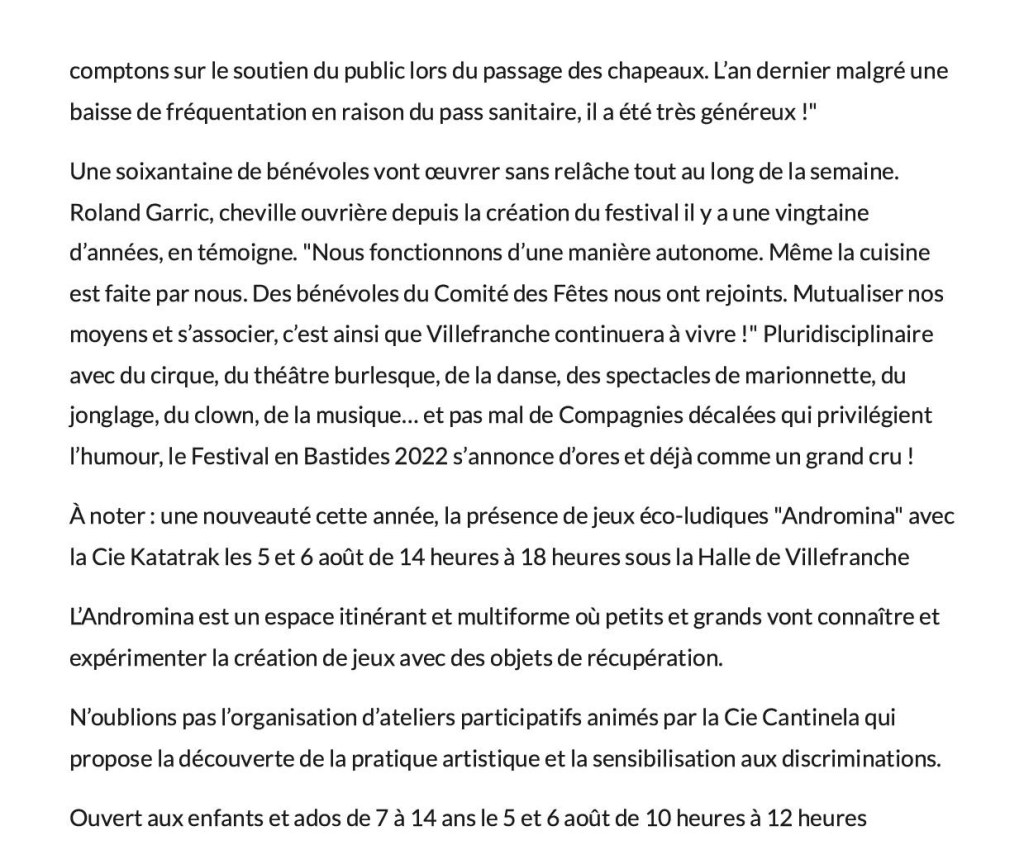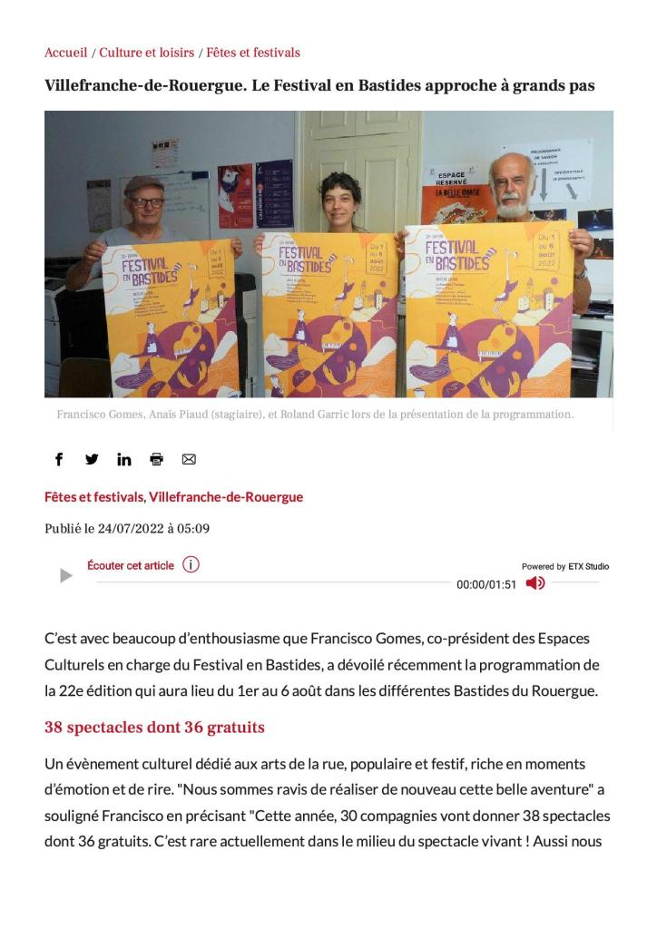Article paru dans La Dépêche du 24/07/22 le Festival en Bastide, co-présidé par les Espaces Culturels Villefranchois.