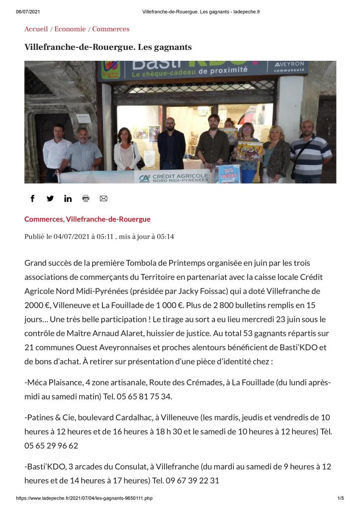 Article paru dans La Dépêche du 04/07/2021 sur les gagnants de la Tombola de Printemps