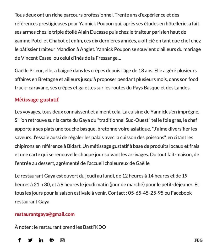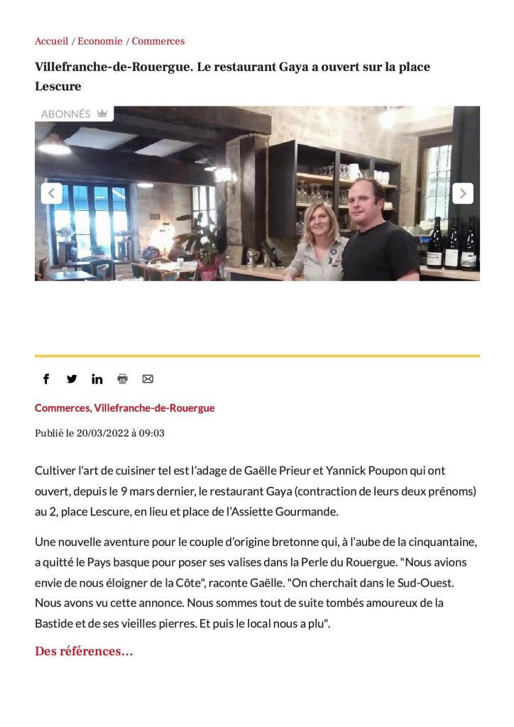Article paru dans La Dépêche du 20/03/2022 concernant l’ouverture du restaurant Gaya