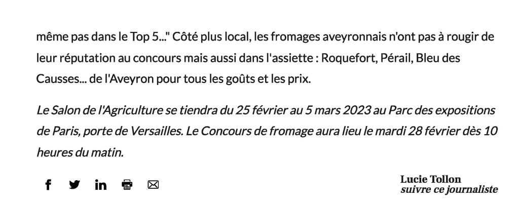 Article paru dans La Dépêche du 26/02/2022 sur la participation de notre fromager adhérent au salon de l’agriculture
