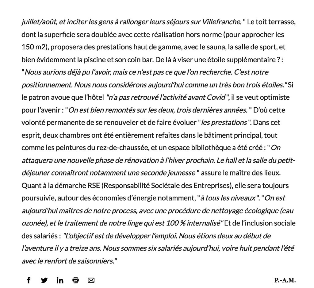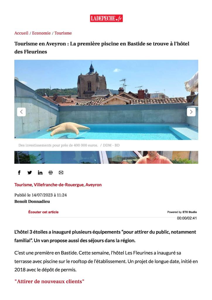Article paru dans La Dépêche du 14/07/2023 sur l’Hôtel Les Fleurines