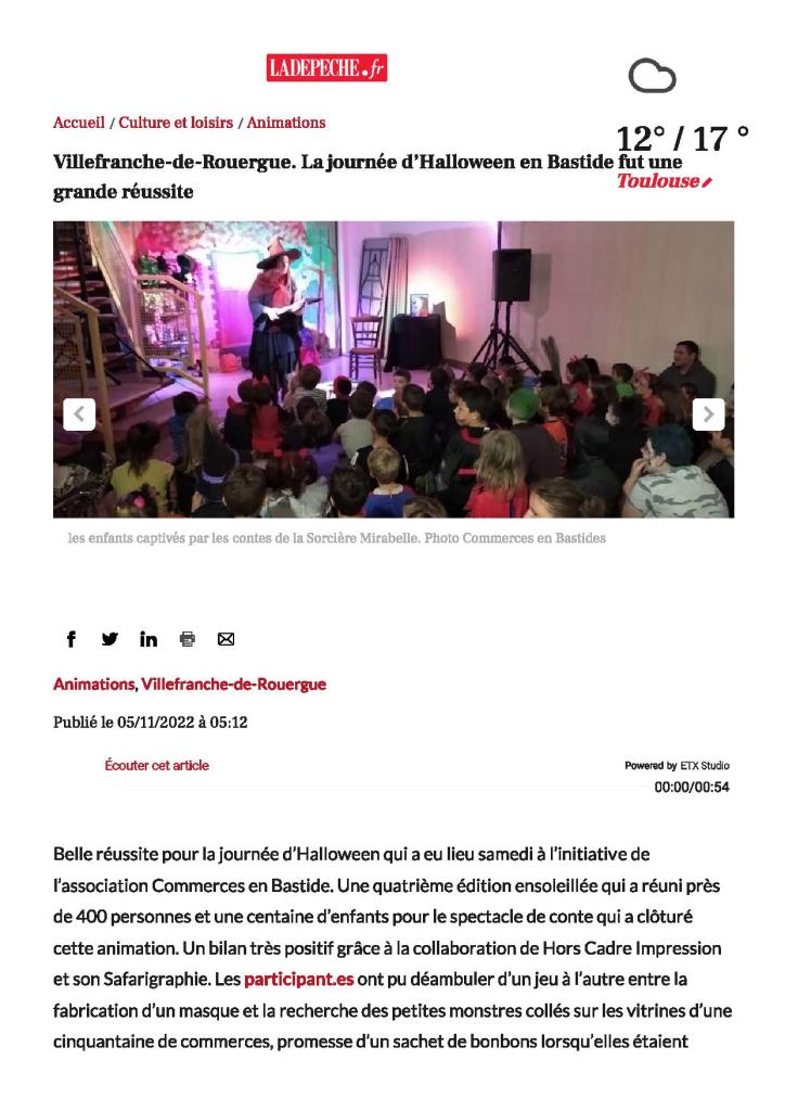 Article paru dans La Dépêche du 05/11/2022 sur le succès d’Halloween en Bastide.