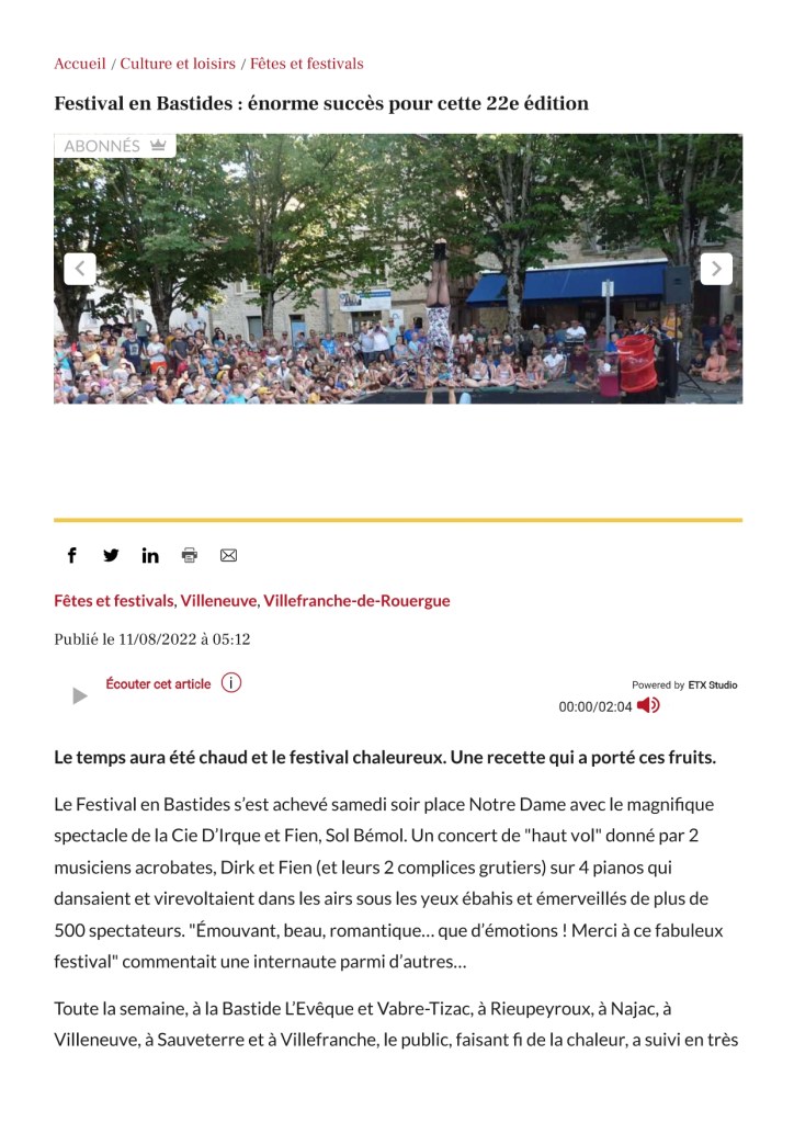 Article paru dans La Dépêche du 11/08/2022 sur l’immense succès du Festival en Bastide.