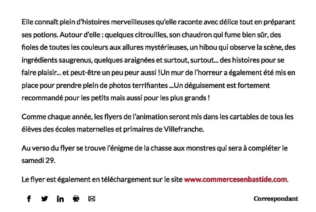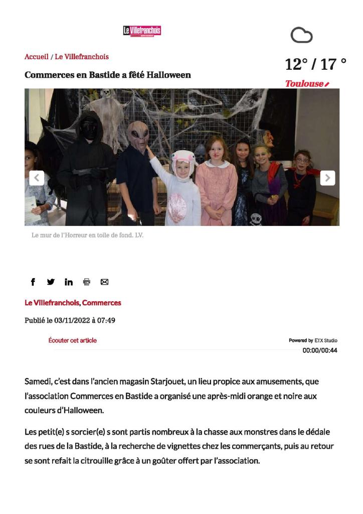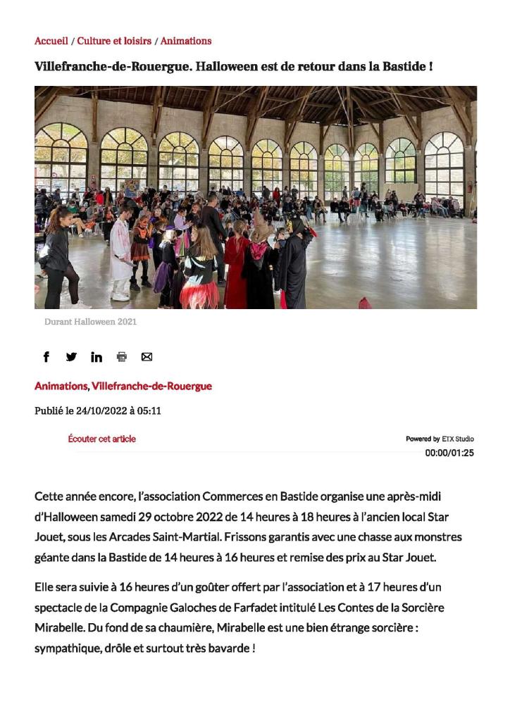Article paru dans Le Villefranchois du 03/11/2022 sur le succès d’Halloween en Bastide
