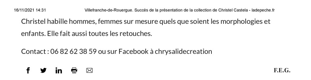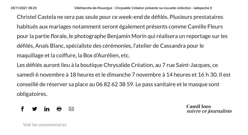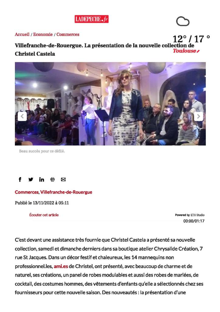 Article paru dans La Dépêche du 13/11/2022 sur le défilé Chrysalide Création.
