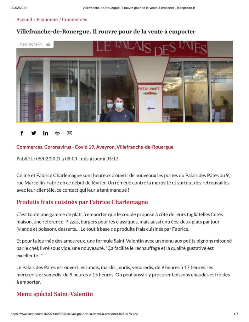 Article de La Dépêche du 03/08/2020 sur l’ouverture du nouveau restaurant Le Palais des Pâtes.
