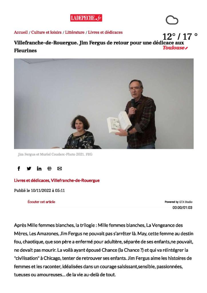 Article paru dans La Dépêche du 21/03/2022 concernant la dédicace du livre de M. Lajoie-Mazenc à la librairie La Folle Avoine