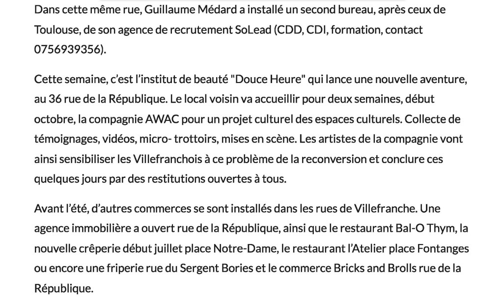 Article paru dans Le Villefranchois du 12/08/2021 sur la braderie des commerçants.