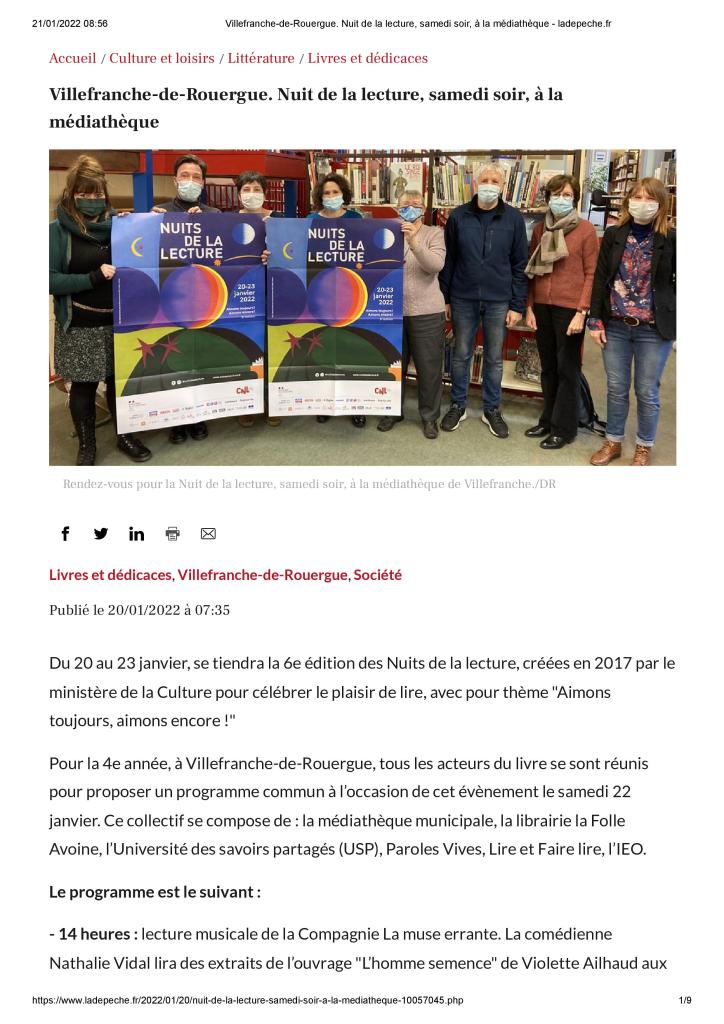 Article paru dans La Dépêche du 20/01/2022 sur la participation de la Folle Avoine à la Nuit de la Lecture