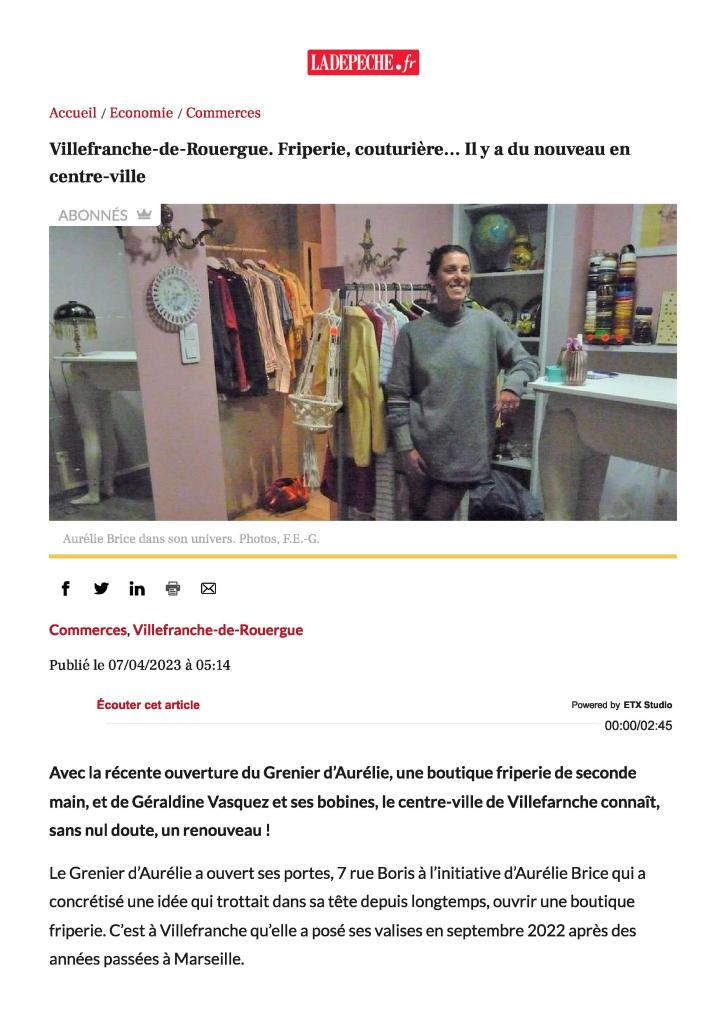 Article dans La Dépêche du 07/04/2023 sur l’ouverture du Grenier d’Aurélie et de Géraldine et ses Bobines en centre-ville !
