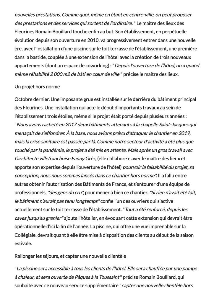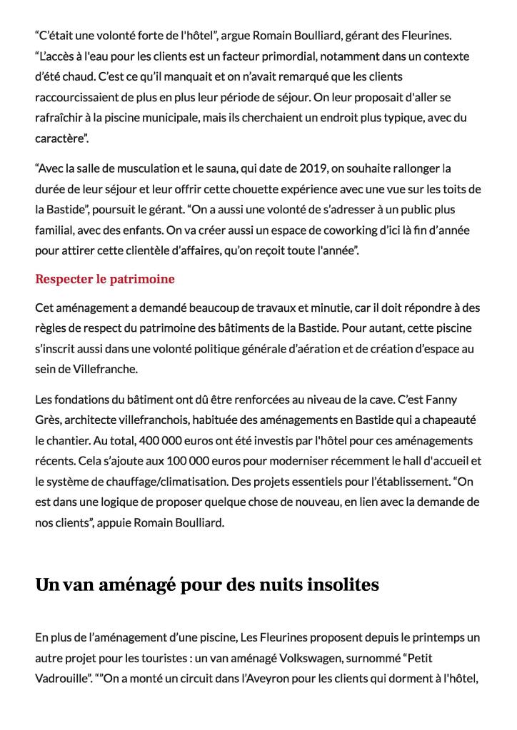 Article dans Le Villefranchois du 13/04/2023 sur la création d’une piscine sur le toit de l’hôtel Les Fleurines.
