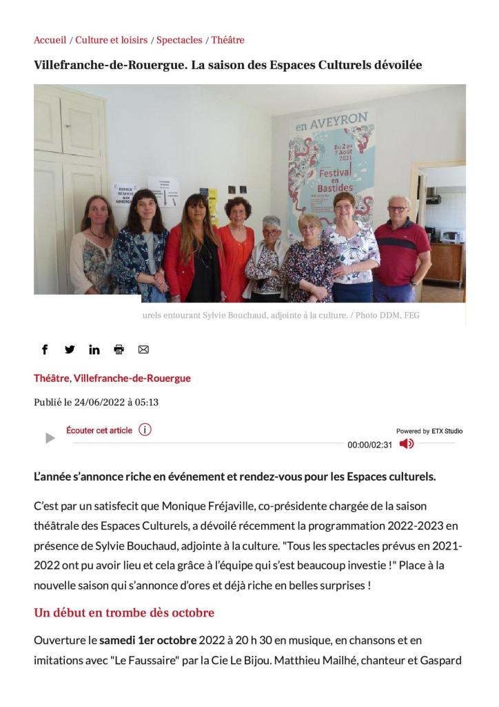 Article paru dans La Dépêche du 24/06/22 concernant la saison 2022-2023 des Espaces Culturels Villefranchois.