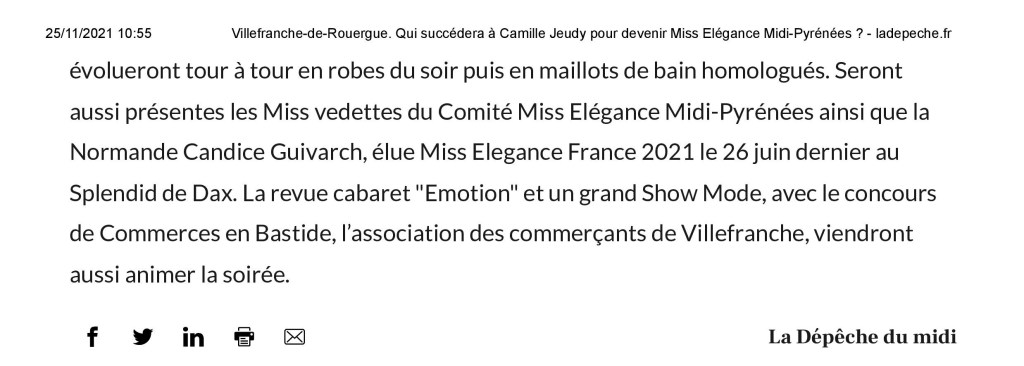 Article paru dans La Dépêche du 21/11/2021 sur l’élection Miss Elégance du 27/11/2021 organisée par le Comité Miss Elégance en partenariat avec Commerces en Bastide et Le Comité des Fêtes.