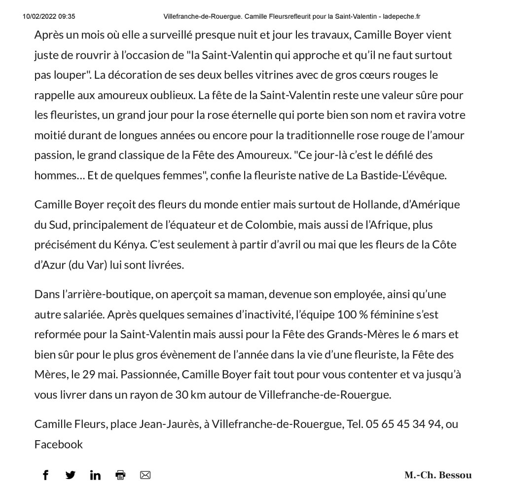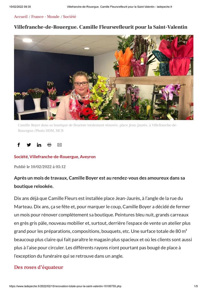 Article paru dans La Dépêche du 10/02/2022 sur la réouverture après travaux de la boutique Camille Fleurs