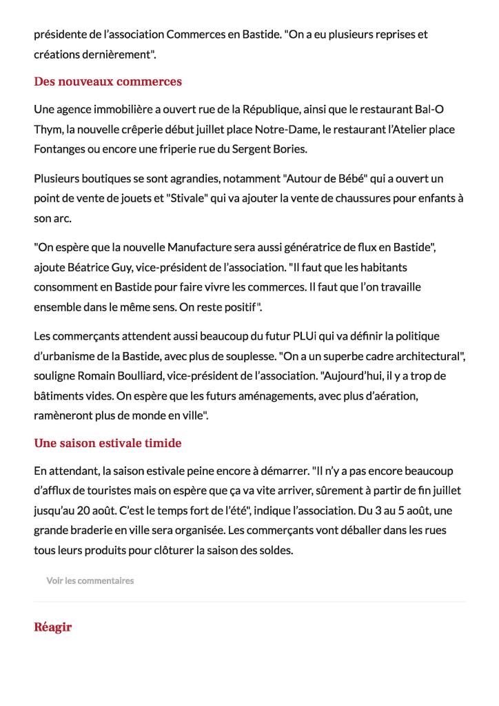 Article de La Dépêche du 17/07/2019 sur les Bastifolie’s et la création du site internet http://www.commercesenbastide.com