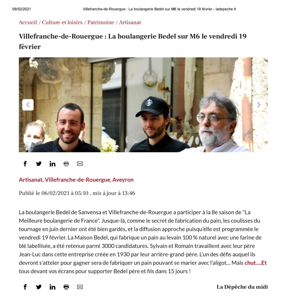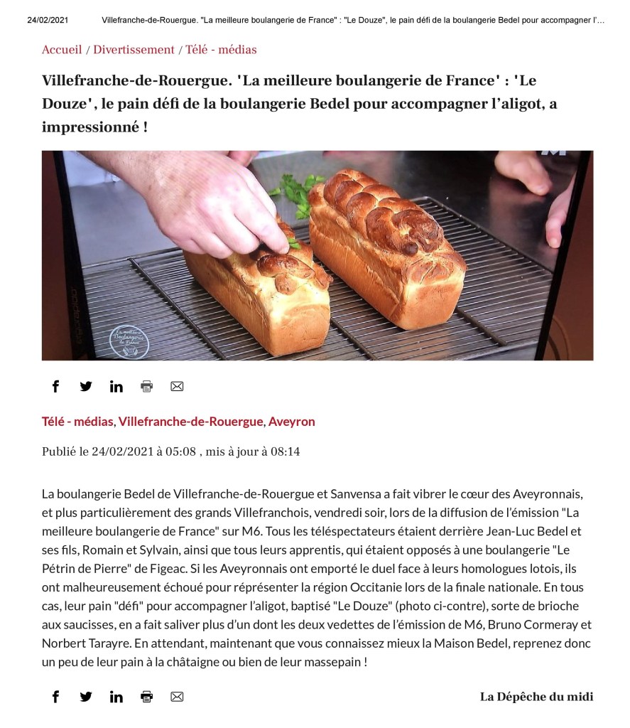 Article de La Dépêche du 11/06/2020 sur la Boulangerie Bedel, qui participera à la rentrée 2020 à l’émission de M6 sur la meilleure boulangerie de France.