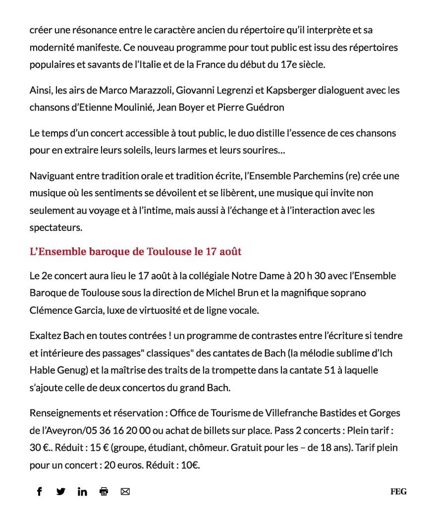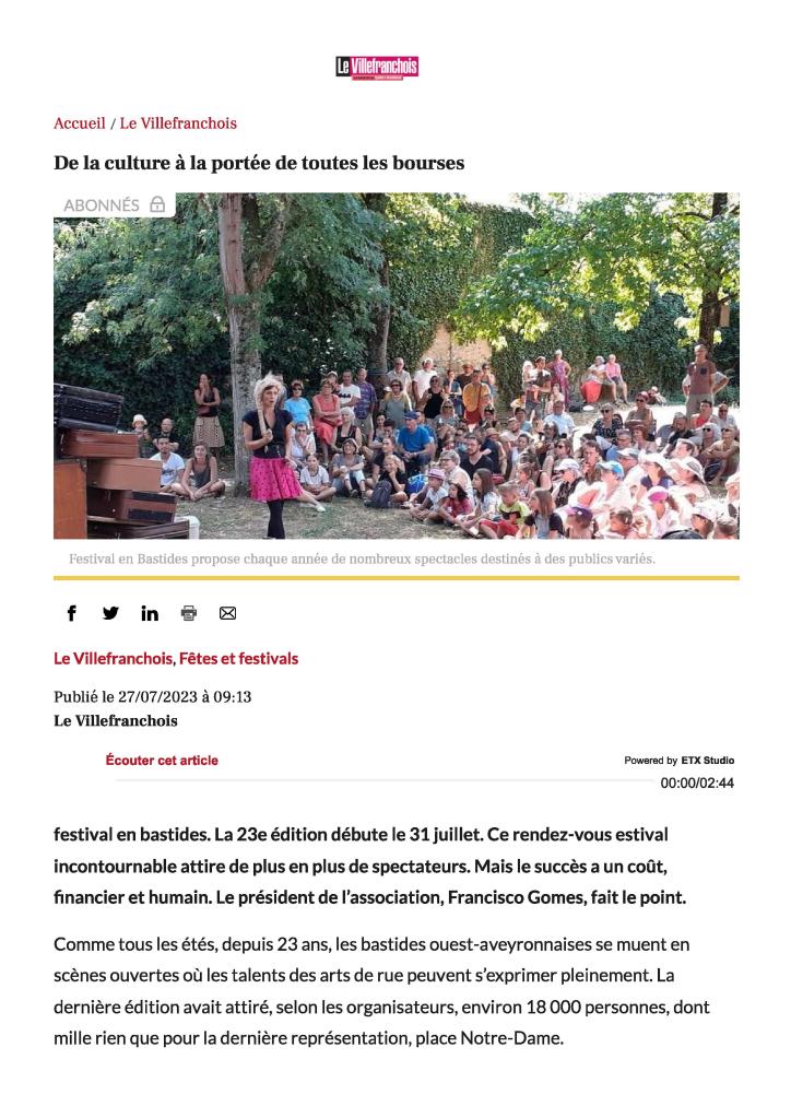 Article paru dans Le Villefranchois du 27/07/2023 sur la 23 ème édition du Festival en Bastides.