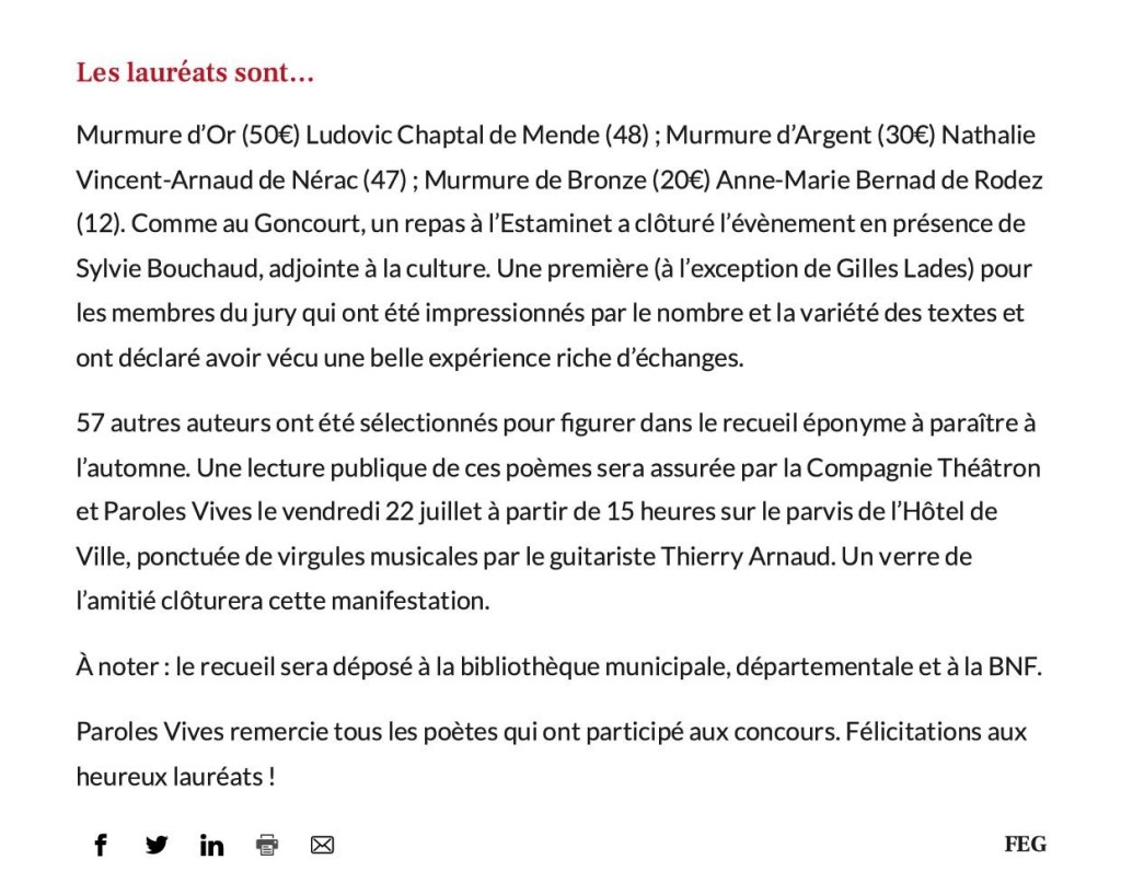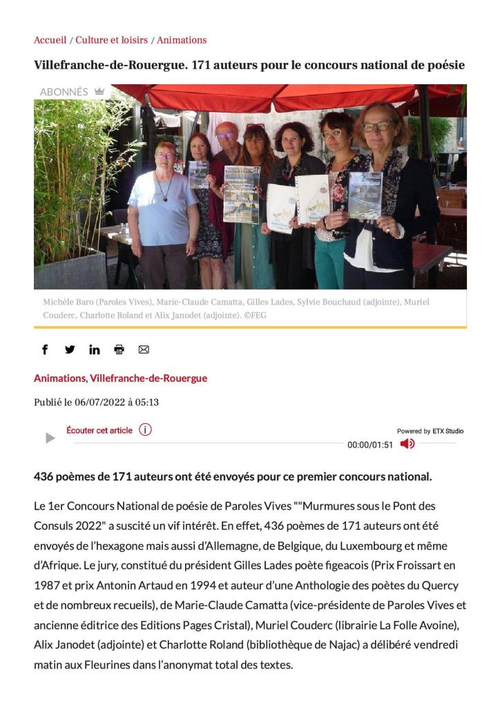 Article paru dans La Dépêche du 06/07/22 concernant les lauréats du concours de poésie au jury duquel figurait La Folle Avoine.