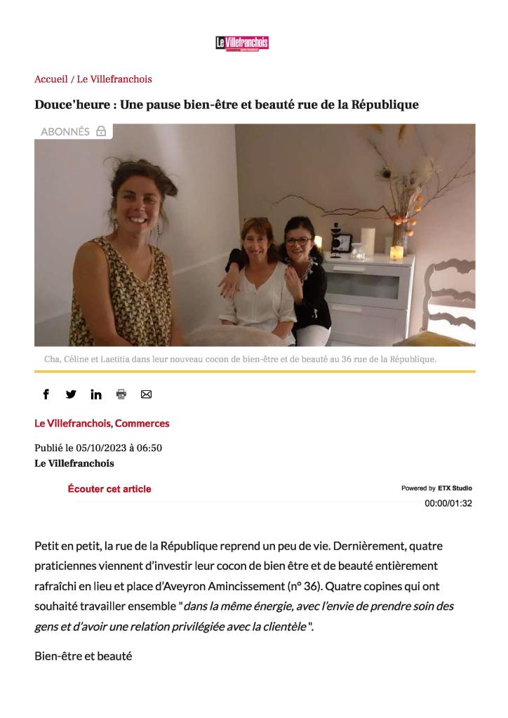 Article paru dans Le Villefranchois du 05/10/2023 sur Douce’Heure en Bastide.
