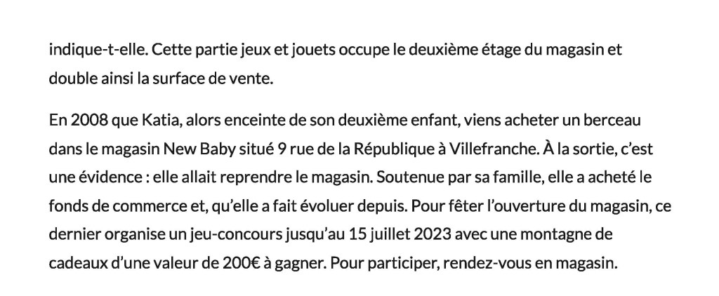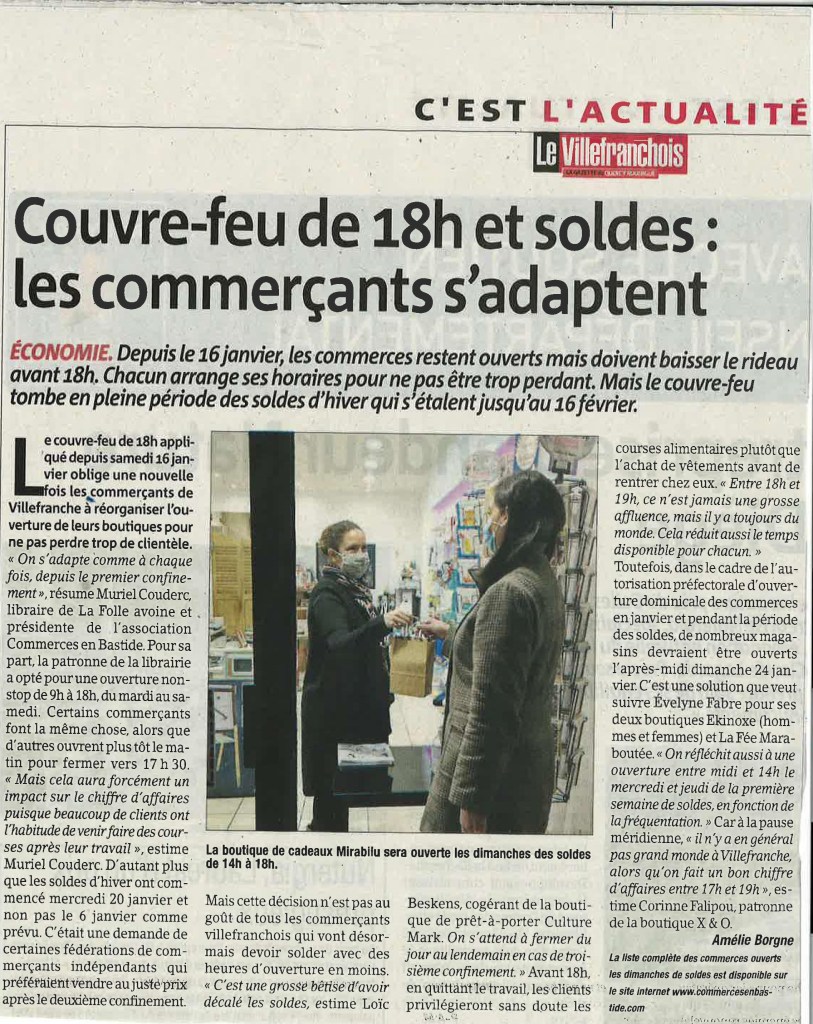 Article paru dans Le Villefranchois du 26/01/2023 sur le départ en retraite de Mme Fabre et sa repreneuse pour les enseignes Ekynoxe Femme et /La Fée Maraboutée.