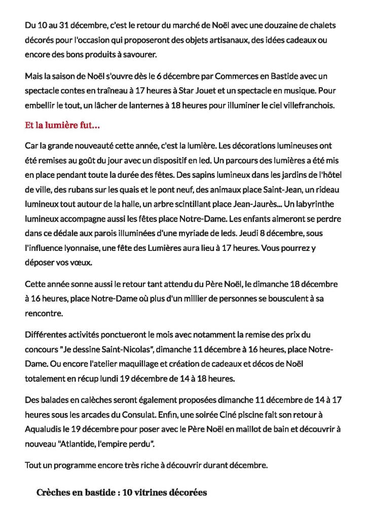 Article du Villefranchois d/u 05/12/2019 sur le programme des animations de Noël de la Mairie et de Commerces en Bastide.