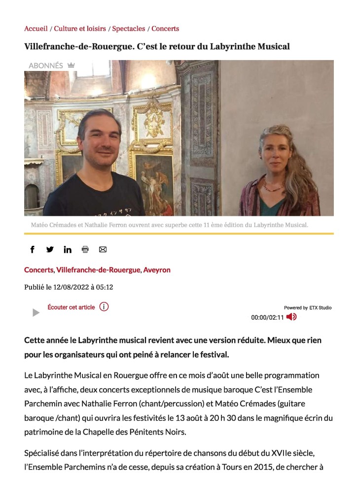 Article paru dans La Dépêche du 12/08/2022 sur le Festival Labyrinthe Musical, adhérent Basti’KDO.