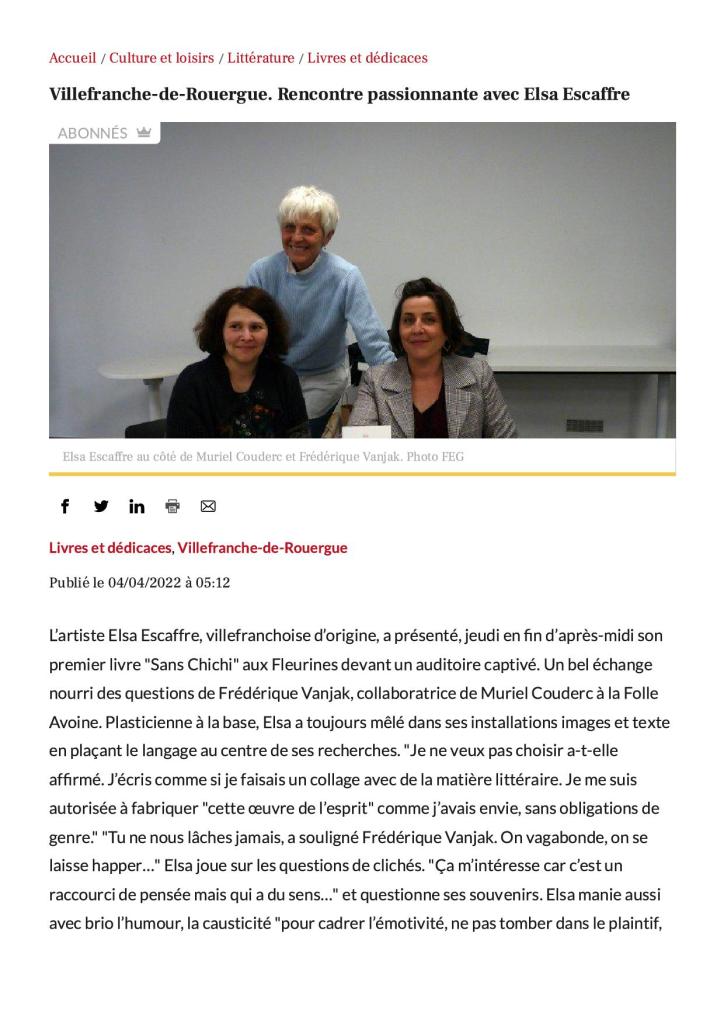 Article paru dans La Dépêche du 04/04/2022 concernant la présentation du livre « Sans chichi » d’Elsa Escaffre organisée par La Folle Avoine aux Fleurines.