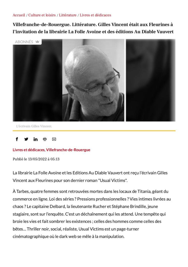 Article paru dans La Dépêche du 13/05/2022 concernant la présentation du livre « Usual victims » de Gilles Vincent organisée par La Folle Avoine aux Fleurines.