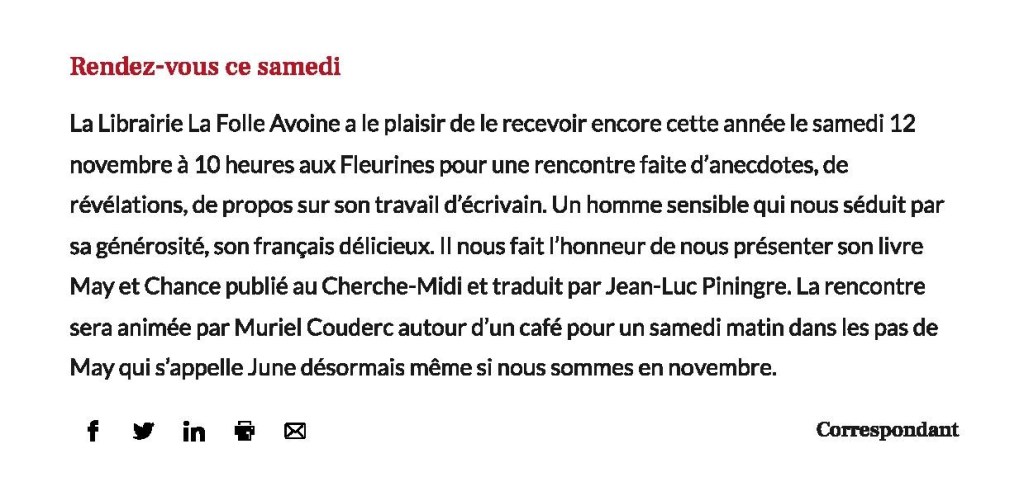 Article de La Dépêche du 20/08/2019 sur la venue du romancier Lionel Duroy, invité par la Librairie La Folle Avoine