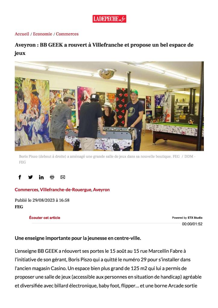 Article paru dans La Dépêche du 29/08/2023 sur l’ouverture de BB GEEK Arcades