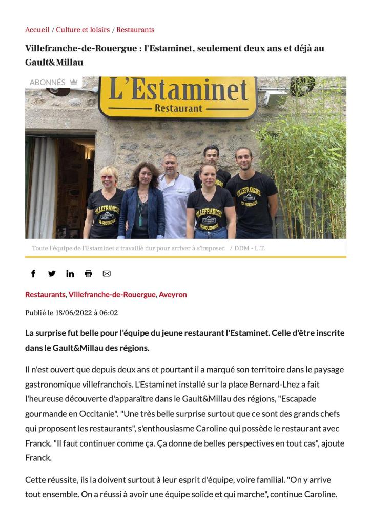 Article paru dans La Dépêche du 18/06/22 concernant l’entrée de l’Estaminet au Gault & Millau.