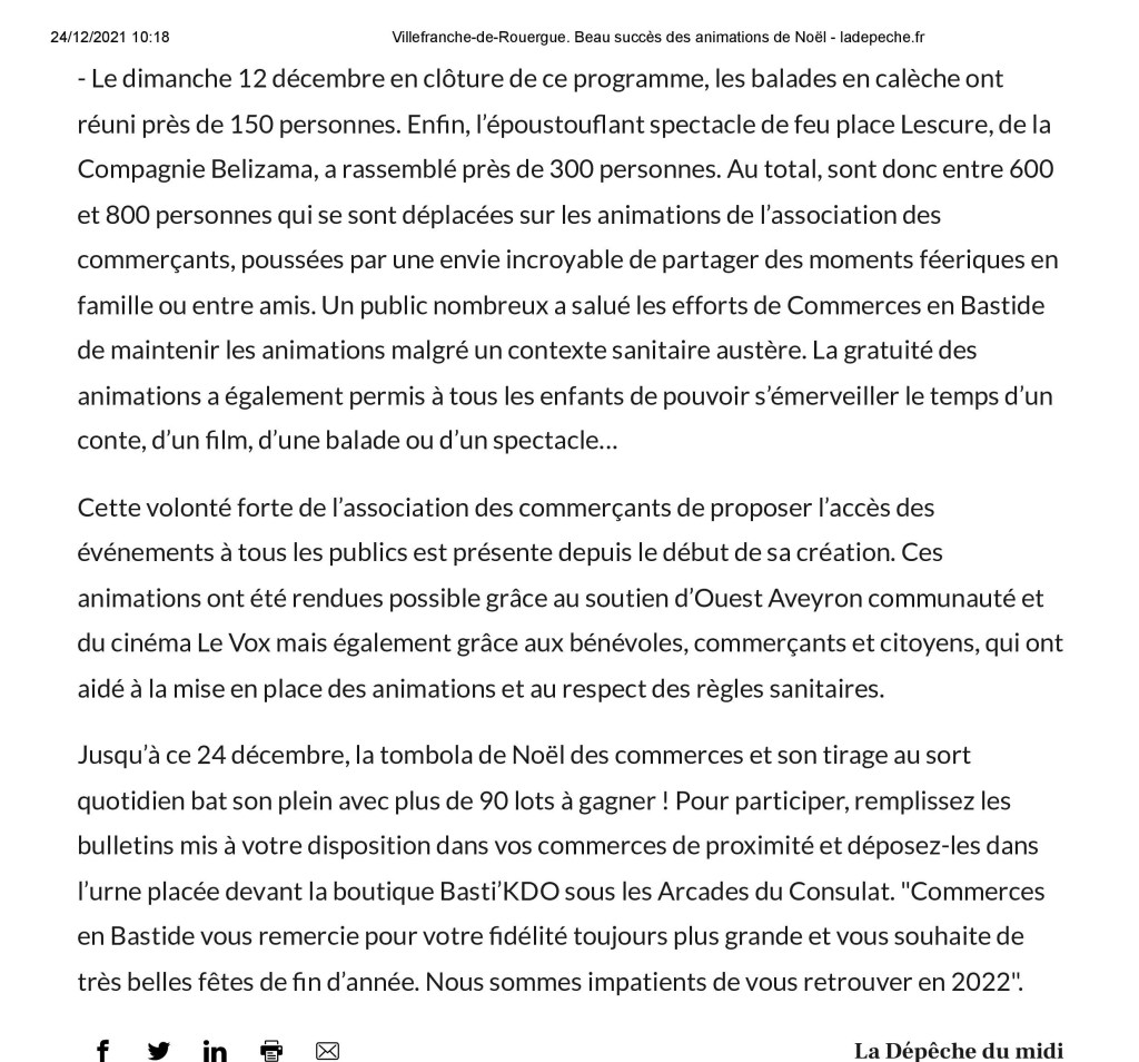 Article paru dans La Dépêche du 24/12/2021 sur le succès des animations de l’association.