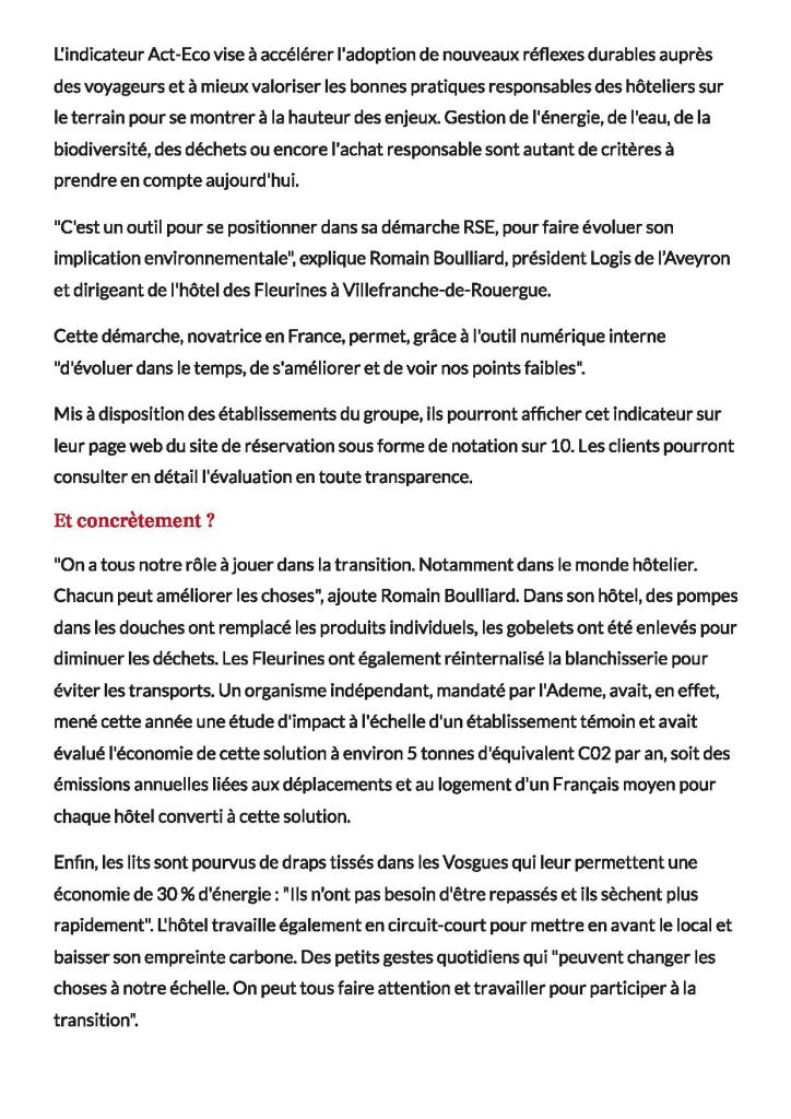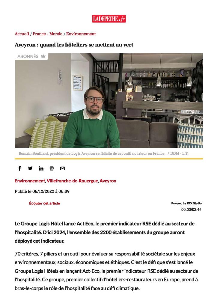 Article paru dans La Dépêche du 06/12/2022 sur l’engagement écologique de l’Hôtel Les Fleurines.